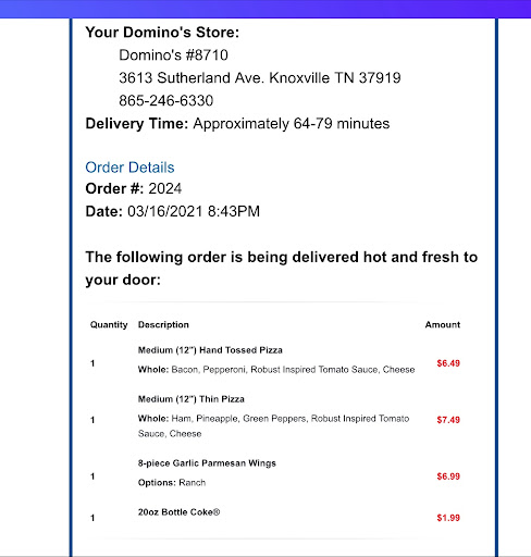 Read moreOn Dec 31st 2019, after moving into a new apartment here in Knoxville Tennessee the prior evening, my and my roommates decided to order some food. The people who took our order were very nice and efficient , they quoted us an arrival time of a bout 45 min to an hour because only 2 people were working and they were short on staff. The order actually arrived promptly at the 35 min marker. When we opened the boxes there were huge puddles of grease in the middle of the pizza. Now not discounting the fact that pizza is naturally greasing this was more than what I would call “in excess” . 31 to the 1st was a holiday so I waited until the 2nd to call. I spoke to a female manager and discussed the problem we had and was told “Well, we would like to make this right” this request was made with persistence as I tend not to accept things for free. They said the next order was on them and I thank her for her time and hung up. February 25 of 2020, I called to have them make good on this promise just to be told my Name, number, address, and you guessed it; credit wasn’t in the system. I told them I could bring bank records, old phon with call log and time in call , etc to prove I ordered food from them. They declined the material. The manager which was also the GM stated he would have to see if the other GM remembered the call and he would get back to me, (still no word). Quality of food from my only experience: 1 customer service: 1 Follow through on promises: 1. This...