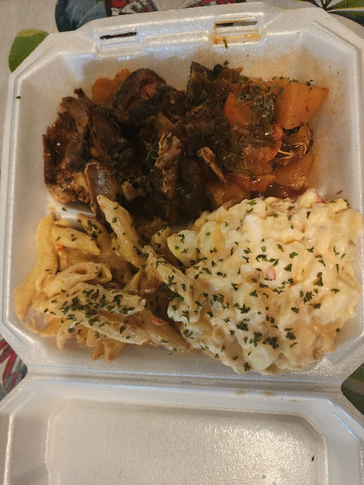 We ordered the jerk chicken, salmon and oxtail. My first time trying oxtail and although itâs not for me, my daughters loved it and said it was well prepared. My salmon and the jerk chicken were perfect and all of the portions were HUGE. We tried the rice, garlic potatoes, Rasta pasta, and my personal favorite- cabbage. If you are someone who enjoys cooked cabbage this is a must try, but donât sleep on the garlic potatoes!