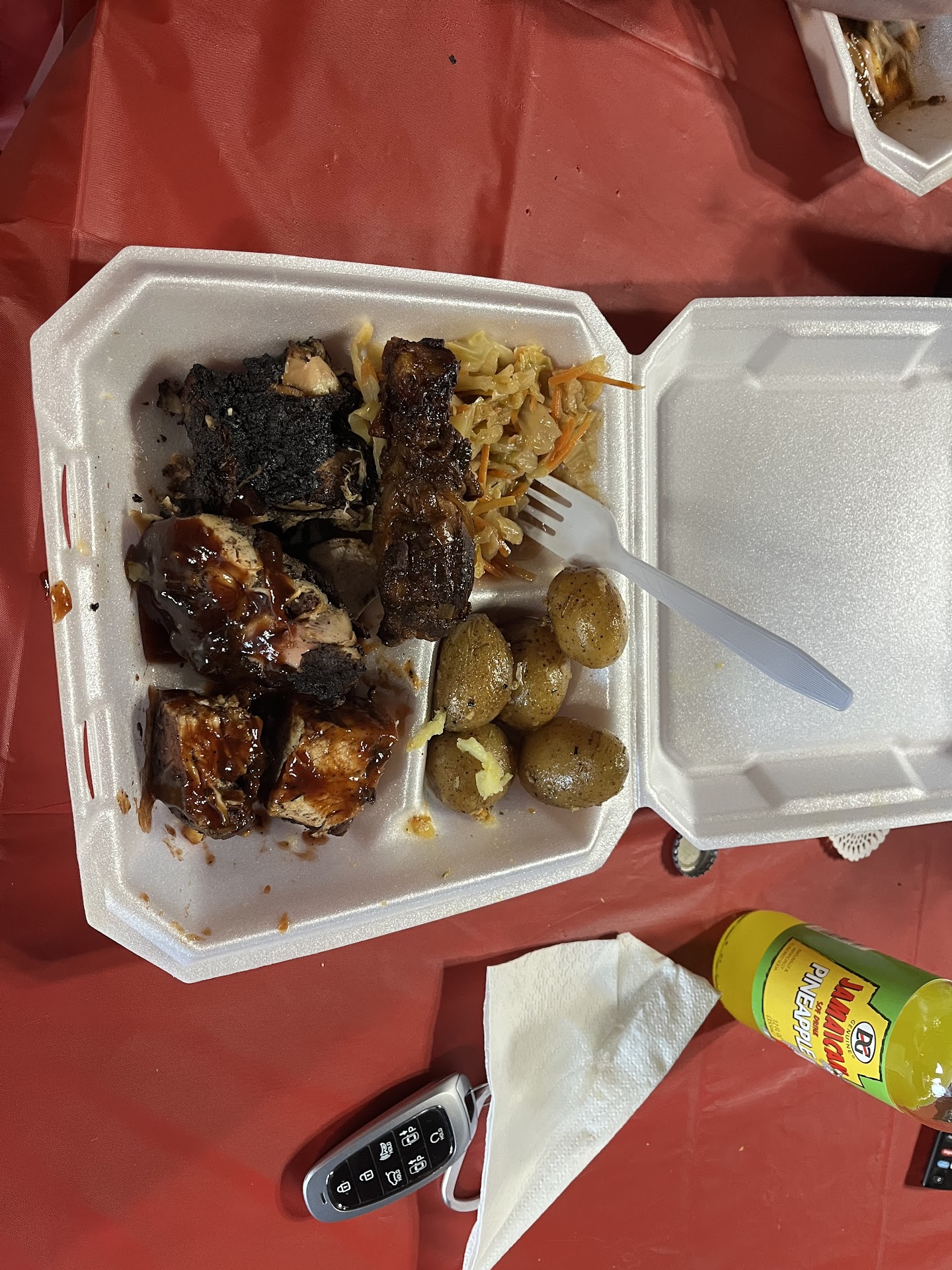 The rice and peas was a bit dry. I'm sure if we got stew chicken the sauce would soft it up a bit. The potatoes salad was tasty! The Jerk Chicken was delicious however I was expecting legs for a small serving not cut up chicken pieces. The portions size for the small seemed a bit small. But it was filling! We also got the red snapper which was seasoned to perfection.