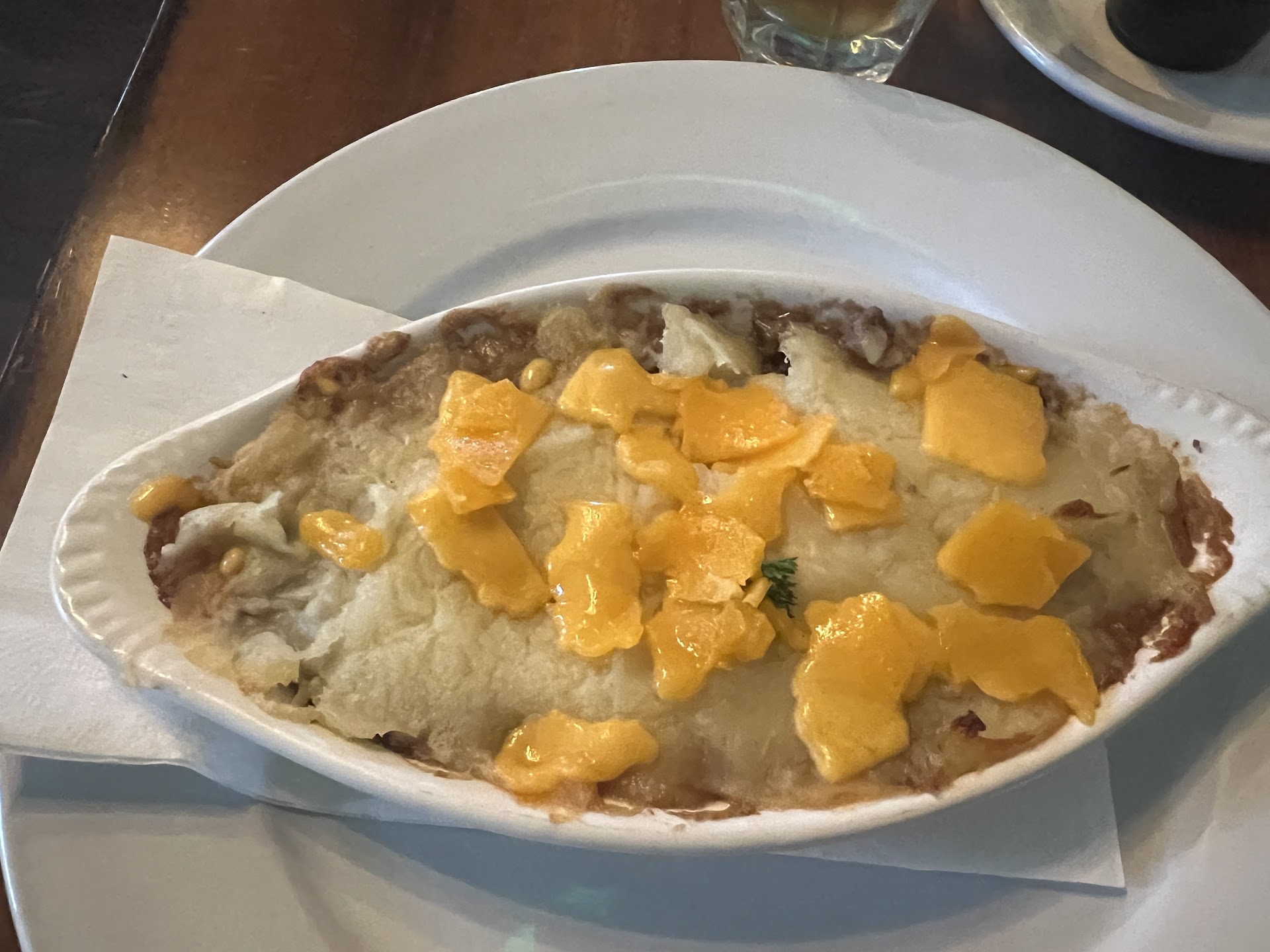 When you first walk in the building there is no sign directing where to go for the restaurant. We stood there until another customer came down the steps, and we asked him where we could go to be seated. He informed us that we are supposed to go upstairs. It was a little annoying, but nothing we couldn’t look past because we were excited about trying this restaurant for the first time. When we first got seated, we looked around and noticed that the atmosphere looked nice and promising. My husband and I decided to try some of their Irish dishes. My husband ordered the fish and chips, and I ordered the shepherds pie. Before ordering we went to Google reviews to look at the photos that have been shared of the different dishes to help us make a decision. One of the things I really liked that I seen in the photos of the shepherds pie is that it had melted shredded cheese on the top that had been browned. The food came out extremely fast. but, upon looking at my shepherds pie, I realized that it did not have any cheese. It was just the mashed potatoes, and they had not even been browned at all. We finally waved someone down to get some help because our waiter did not return after we received our food. We informed them that the shepherds pie did not have cheese on it and they said they would take it back and put some on for me. No apologies. No big deal until…my dish came back out a few minutes later with… a slice of cheese that had been torn by hand and not melted or browned at all. (see picture) we showed this to our server but he acted like it was no big deal and that cheese wasn’t even supposed to be on the shepherds pie but that wasn’t true. We asked if I could order something else so he said yes and I ordered the bangers and mash. Which was OK, nothing special for two sausages and a small amount of mashed potatoes for $18. The waiter never apologized or offered any type of discount because by the time I received my food, my husband was already completely done. That’s how long it took. I would NOT...