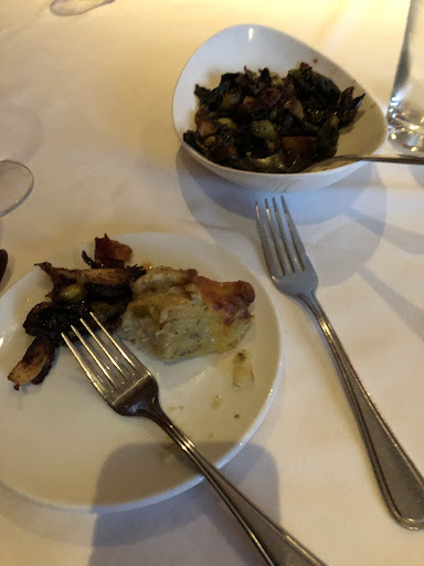The main course was even better! The prime dry aged ribeye steak was succulent and my husband really enjoyed the filet mignon. Our friends had the Diablo shrimp on top of their prime dry aged ribeye and they were very impressed. We also had a few sides. Our friends were there last night and highly recommended the lobster Mac and cheese. That is to die for, best I’ve ever had. The crispy Brussels sprouts with bacon were amazing as well. Honestly, my husband ordered the potatoes au gratin but I didn’t want to waste my appetite on potatoes. Since we all stuffed ourselves and didn’t leave room for dessert, I snuck a taste of the potatoes when we got home. They were outstanding! There was so much food, I have an entire meal left over for lunch tomorrow.