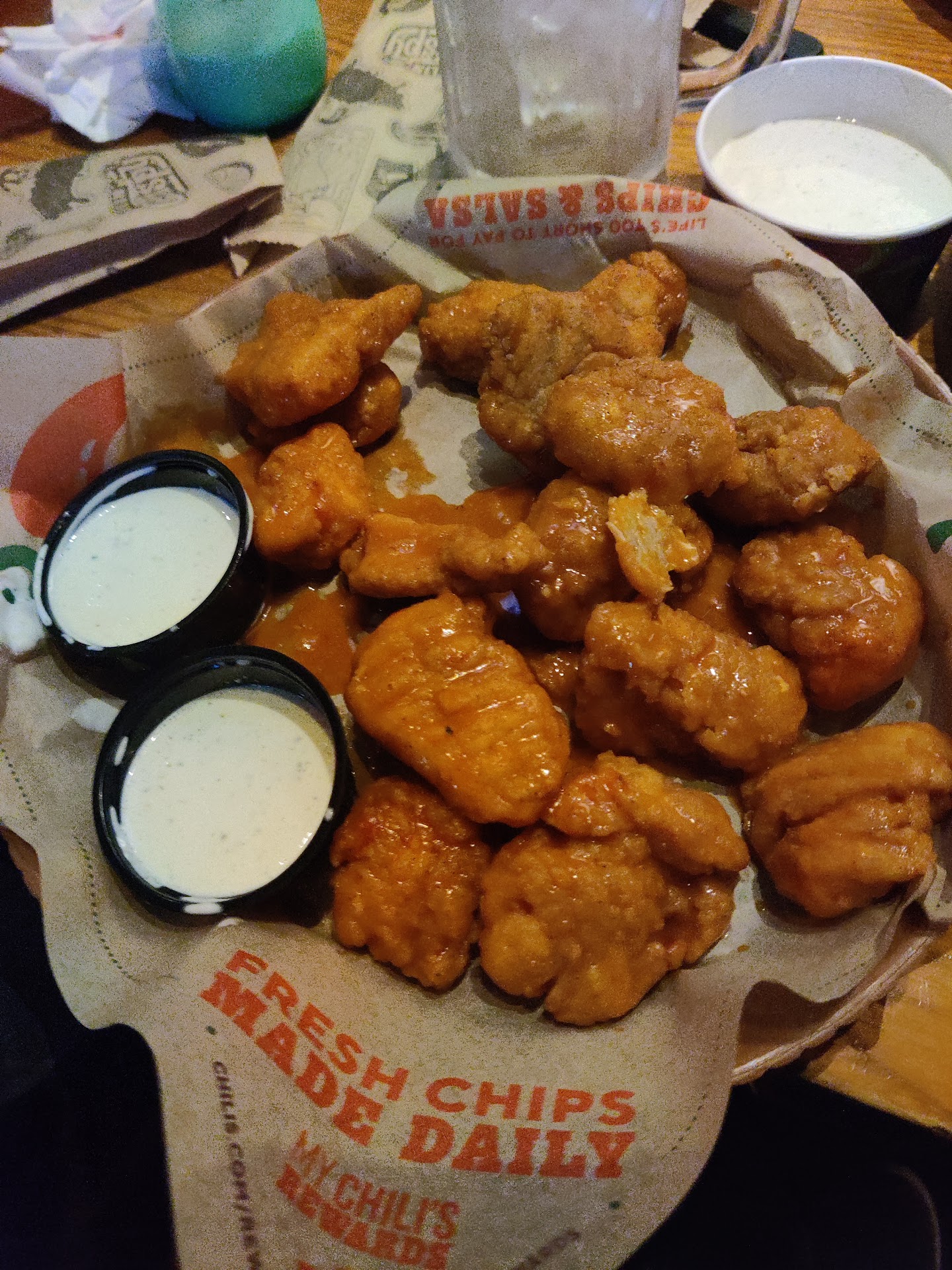 Original review: I ordered the honey sriracha wings and they hardly had any sauce on them. It looks like someone squeezed a few drops on and thought it was fine. Also the ranch they give you is clearly 90% water mixed with ranch. Just go to...