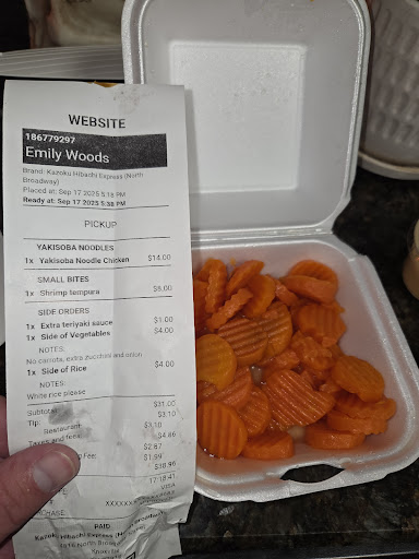 I went to the location on Broadway and the food is usually good. Today it was not good at all. First the lady at the window that takes the orders had a bad attitude but she always has one. I placed my order letting her know that on one of the orders that I only want carrots and would like extra carrots since that one is not getting zucchini. She asked if I wanted onions on both and told her yes I do. When I got my order there wasn’t extra carrots on the one order. I went back to the window and explained this to her. She then proceeded to tell me it was extra carrots but I looked at my other order that I didn’t ask for extra carrots and it was the same small amount. I didn’t argue with her I just said well I would like extra carrots how much. She said 4 dollars. I was aggravated because I just spent 27 dollars for the food but I paid it and left. Now I get home to eat it and there aren’t any onions on either one of my orders. The carrot tastes like they are straight out of the can, the rice was very dry and so was the chicken. I also only received shrimp sauce not any teriyaki sauce to make this dry food better. For the prices and the service you get I will just go else where not worth...