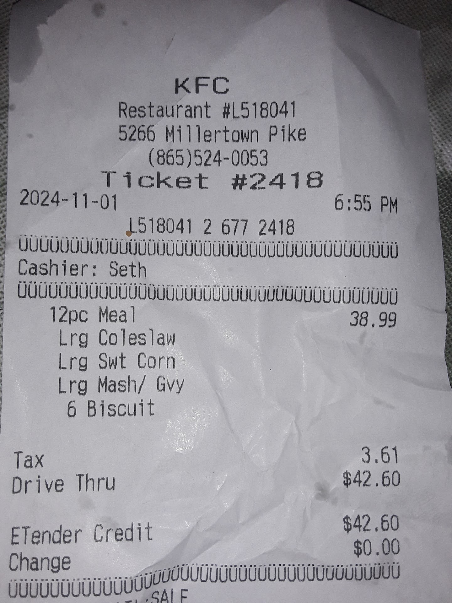 Read moreThe service with KFC was awful. Tony York is a horrible manager. I wasn't able to get what I ordered and was asked to accept something different. I was told I would have to wait 20 minutes. When I said I will wait because there were several pieces of chicken they didn't have in original recipe. He said it will be 25 minutes I haven't dropped any chicken. When I asked will I be compensated for excepting 5 pieces of crispy chicken in place of the 8 pieces of Original recipe I paid for, a cup was slammed on the counter an offered as compensation. When I refused to accept the rude way he attempted to compensate me. He asked did I want my money back? There was no apology for not having what I paid for. I will never forgwt the way I was treated. Nobody deserves to be treated this way. I pray this thoughtless act wasn't racially motivated. His customer service skills were terrible. I have been doing business with KFC for years and this is the worst service I have ever encountered. Tony York represents your company in a negative light. With managers like Tony York representing your company and setting an example for other employees your company will not be in business...