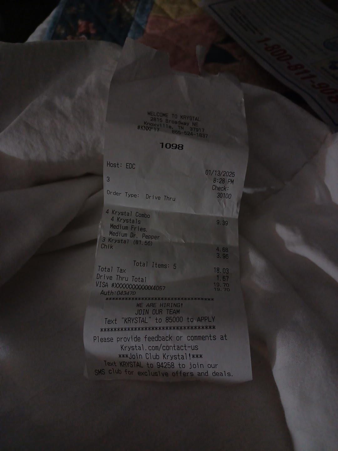 Read moreI was just their and excited to get the 4.99 deal. haven't been there sense the pandemic. What I got instead, (dead in the window) waffle fries- (and theirs only two waffle fries with crumbs in a bag the size of a baby food jar)- tasted like dried up hollowed out cardboard. The coke was short filled and flat and no napkin...UNACCEPTABLE! At this point I didn't trust the two Krystal's so I turn around to get a refund. I got a refund but not without a barrage of excuses to why I shouldn't be complaining. "I been here bla bla years and never had this happen" mgr said. no apologie about why the coke was flat or any of the other concerns, what she should have said is this~ (sorry your not pleased here a voucher or meal replacement and come again). They don't do that anymore, now its all about putting the guilt trip on you. (your the problem) so so so sick of that gas lighting and for that GAS-LIGHTING!, you got a review. I also will be checking my bank to make sure I got a refund. So sad that the principle of customer service equality has...
