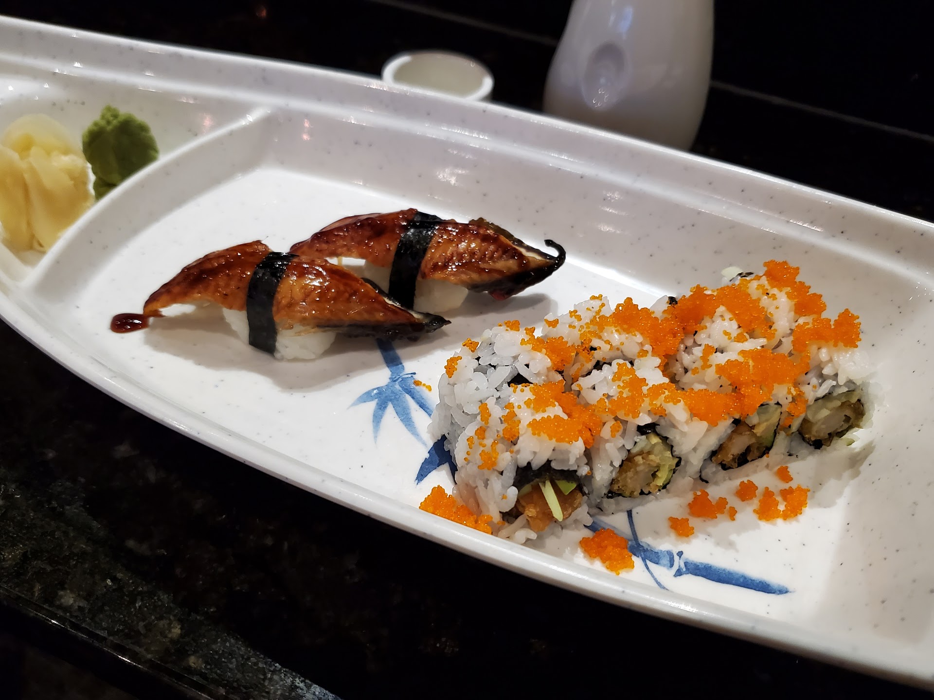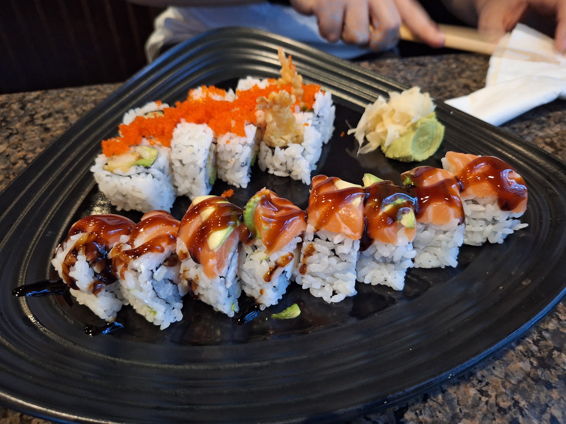 The search continues...for a great sushi place to become our fav! This is definitely not the one. Table service was about a 15 minute wait, so we started to have high hopes, but those dropped quickly. We ordered drinks and our apps. The busser was quick to get the drinks. He did tell our waiter about our app order. The gyoza was decent, semi soft with a crispy edge. The spring rolls, which came much later were burning hot inside, slightly burnt but cold outside and covered in sauces. Trying to hide something??? The little plates they gave us were all dirty. One of them has a good size piece of lettuce stuck to it, gross ๐ We ordered sushi so I cannot comment on the hibachi. Let the waiter know that I have a shellfish allergy and I clearly marked it next to my rolls that I was ordering per the waiters recommendations. I ordered a sushi roll and a fried sushi roll. My husband also ordered a sushi roll and fried sushi roll of different kinds. To our shock and surprise the 2 fried rolls were on the same plate. And our non-fried rolls were one the same plate. WHAT? I'm just lucky that my husband didn't order something with shellfish in it, or should I say they are lucky. We've never seen that before and we're just dumbfounded. We waited almost 10 minutes for our sons order to arrive. Which were not gonna eat while our son sits and watches. The containers they gave us for the soy sauce were also filthy and we could not use them. The sushi rolls were all covered with sauces and it made it hard to taste the actual roll. And when we were about half way through our rolls the waiter brought us "soup", which he said he was going to bring us at the stadt of the meal. It was chicken stock with one slice of mushroom and some small pieces of I dont know what. The deco is older and in need of repair/ replacement. Overall, very unimpressed and not worth the $$$ spent on this meal. We won't...