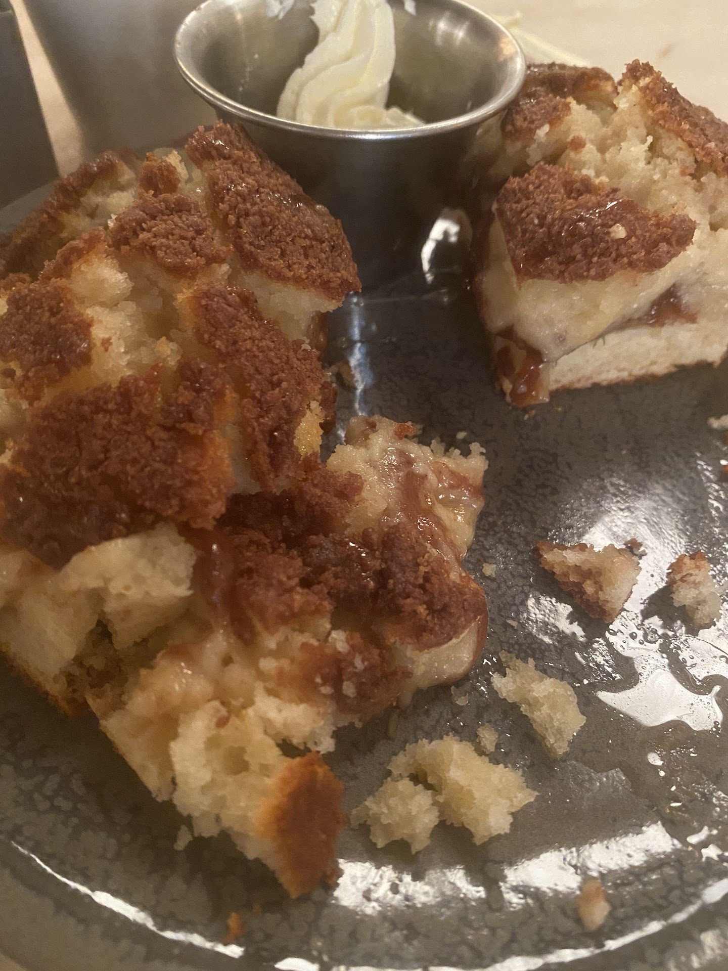 So, today, we finally ate brunch at Oliver Royale and, boy, were we shocked and disappointed. Billed as an “exemplary dining experience” we were completely underwhelmed right away as we watched the bartender make our mimosa with prosecco and grocery store juice. The wait time to even get brewed coffee was surprising, but our rule is to never be in a rush for brunch. When delivered, the coffee was exellent, so we remained hopeful the food would be worth the extended wait time. The first food item to arrive was the shareable coffee cake – after approximately 30 minutes from when we placed the order. As seen in the photo, the cake we received was not fully cooked with half the cake still in cake-batter form. In fairness to the server, who was not responsible for making the food, we did not send it back. However, later as we went to pay, the server noted that the cake taken off our bill. We were thankful but also curious if that was an indication this was not the first time it happened. We waited an hour for eggs benedict and steak and eggs. The food was fine. The hollandaise sauce on the eggs benedict was perfect, even if the dish was served closer to room temperature than fresh from the prep area. The steak and eggs were mediocre and also seemed as though the dish had been sitting for a bit before it was delivered. Also, the toast was served dry and there was no butter or jam served alongside it.
