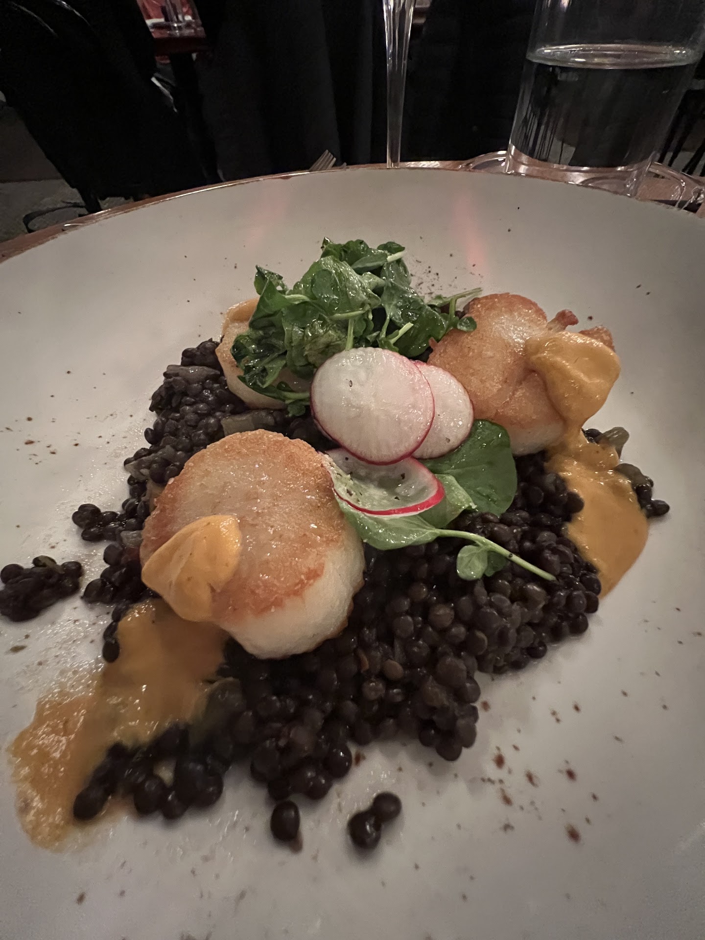 Three scallops were served for an appetizer, and one of them definitely turned bad. We had to spit it out because we were afraid of getting sick. So we had to order something else. The shrimp and grits were great, though. Excellent texture and flavors.