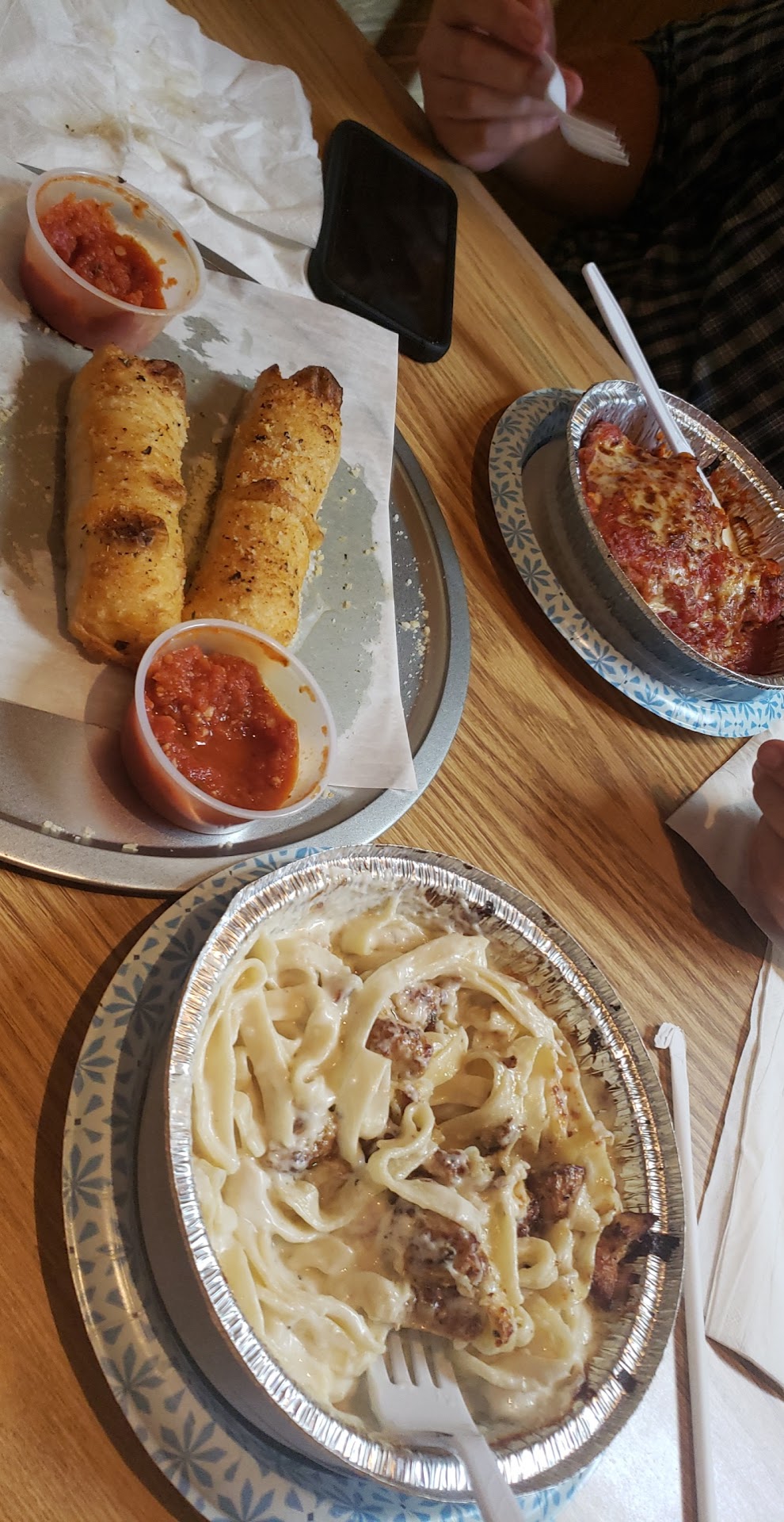 We were passing through Knoxville somewhat late at night (after 9pm, which didn't seam unreasonably late to us, but apparently most local businesses differ in opinion), and this was one of the only places that was open that looked decent, where we could sit down for a meal. It's right next to the university, and a good number of college students trickled in after we were seated. I imagine this place does a lot of takeout and delivery. The food we ordered came out very much like if you were to plate up a takeout dinner straight from the box: plastic flatware, condiments in packets and little plastic containers - even the Parmesan cheese we asked for came out in packets instead of a shaker.