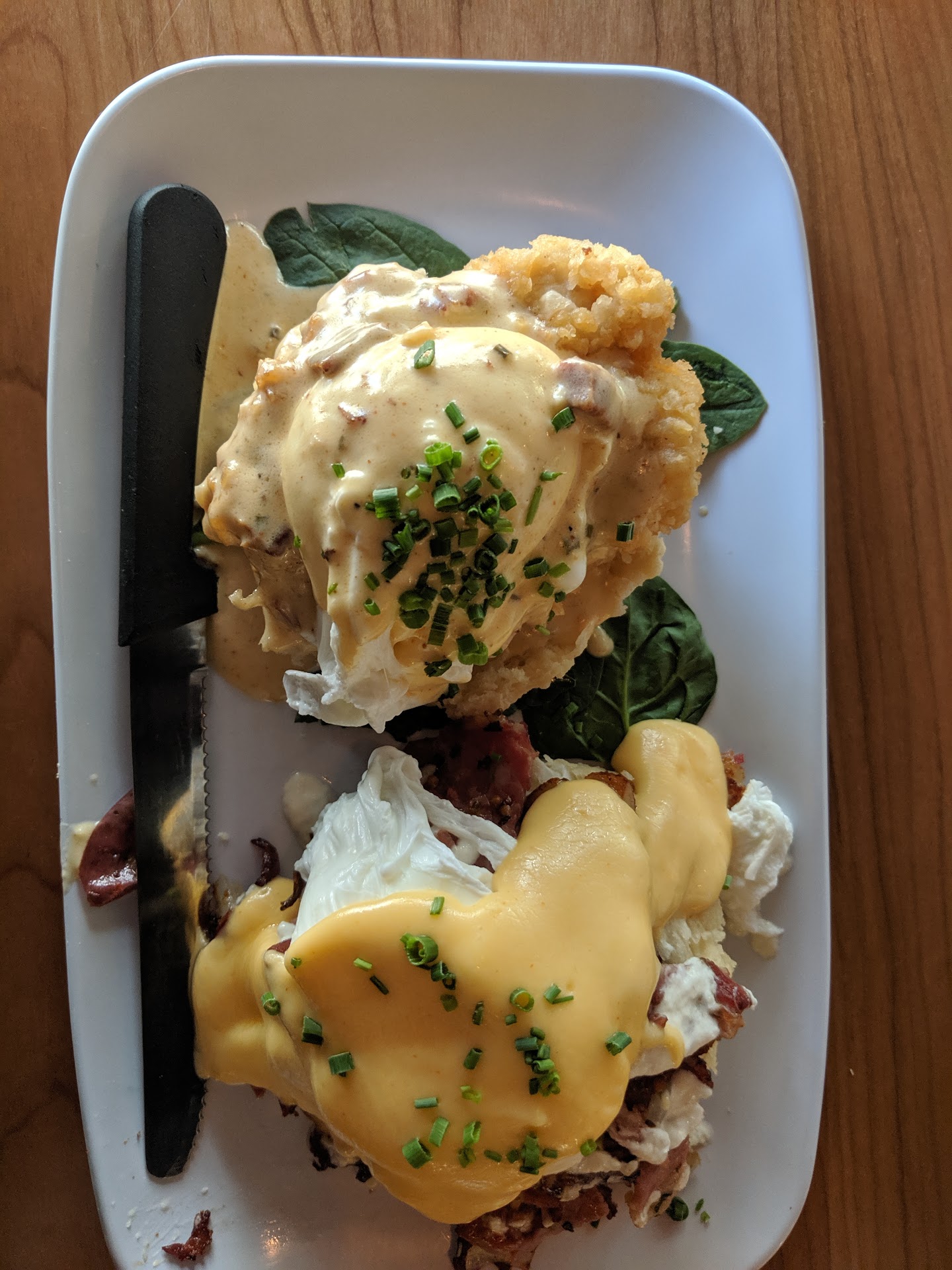 Food-- the food was very good. I had the Chicken St. Charles and Corned Beef. Both were plays on the Eggs Benedict. The Chicken St. Charles had a perfectly poached egg that oozed all over the biscuit like it should. The fried chicken was moist, but could have used a touch more seasoning. The hollandaise sauce had a nice kick, which really added to the dish as a whole. The Corned Beef Eggs Benedict was nearly perfect. The Corned Beef was tender and obviously already salty, so seasoning was not lacking. The sauce was delicious, and the egg was still good while being slightly over poached. I also tried the pig candy bacon, which was good, and the Eggs Cochon (another Eggs Benedict dish), which was probably the best of the three I had.