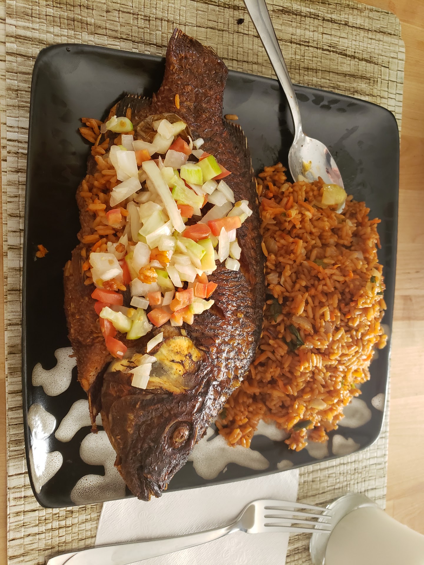 I was very disappointed in the food and I would only return if I wanted to purchase some of the grocery items. This place is a real dive...located in a run down strip mall that is difficult to locate. The interaction with the people (employees) was unpleasant to say the least. I was clearly an unwelcome visitor. I had a "Groupon" coupon which they would not honor that could have part of the reason. I decided to order anyway since I was excited to try this style of cooking. So....several of the items I wanted they were out of. I ordered two dinners one was fried chicken (5 wings only) with a lightly seasoned couscous with a diced onion,tomato,cucumber like salsa; second was grilled talipa(whole fish..head included) heavily seasoned that was very tasty served with a seasoned rice(red in color)mixed with slivers of carrots and onion also with some of the tomato salsa mix. The fish was very good just dealing with the bones(which I don't mind)that you have to be careful of. Cost was almost $20. Meals were filling. Atmosphere non existent, unfriendly environment. I got my meals to go. There are tables to sit at but ..... I can not recommend visiting this place which is unfortunate because I was excited to try...