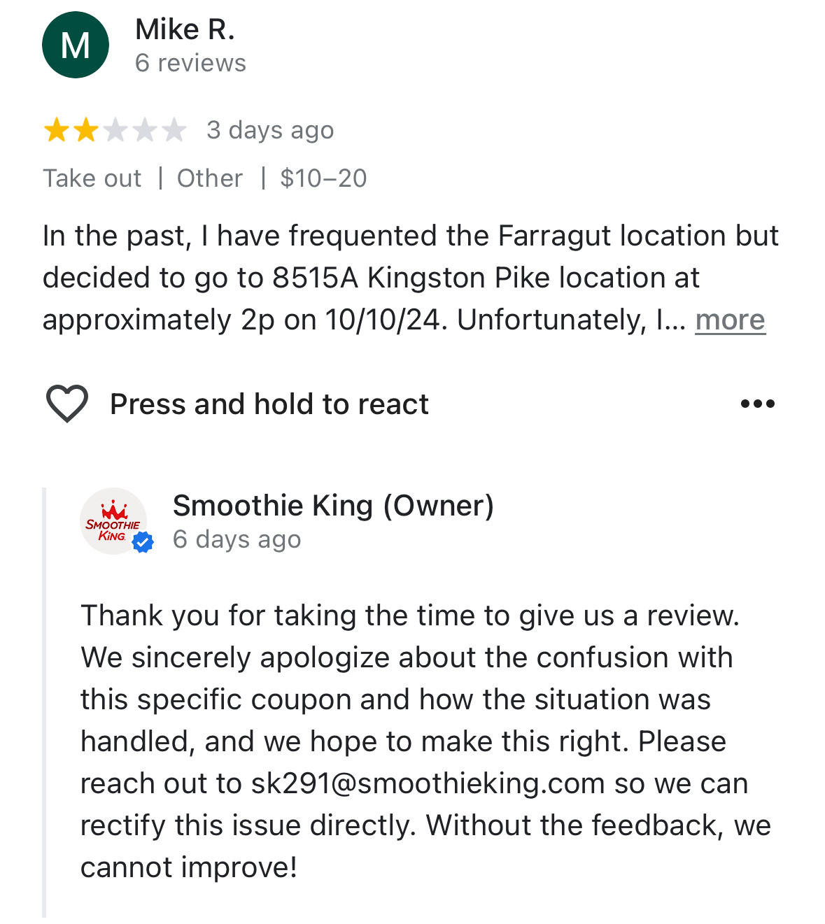 In the past, I have frequented the Farragut location but decided to go to 8515A Kingston Pike location at approximately 2p on 10/10/24. Unfortunately, I encountered extremely rude service. In short, I was attempting to use a Clipp/Local Flavor gift certificate (paid $8 for $16 worth of Smoothies) which should have entitled me to a $16 discount on my order. The person attempting to help me didnât know what to do with the certificate and called another employee (presumably the shift manger?) who told me that I was entitled to an $8 discount. When I attempted to explain to her the way the gift certificates works and the way that it was honored correctly at the Farragut location, I was rudely informed âI do this all the time!â. After the interaction and paying $8 more than I should have, I pulled up the gift certificate and explained it to another staff member who simply informed me that âthey didnât knowâŚâ Overall, a very disappointing experience.