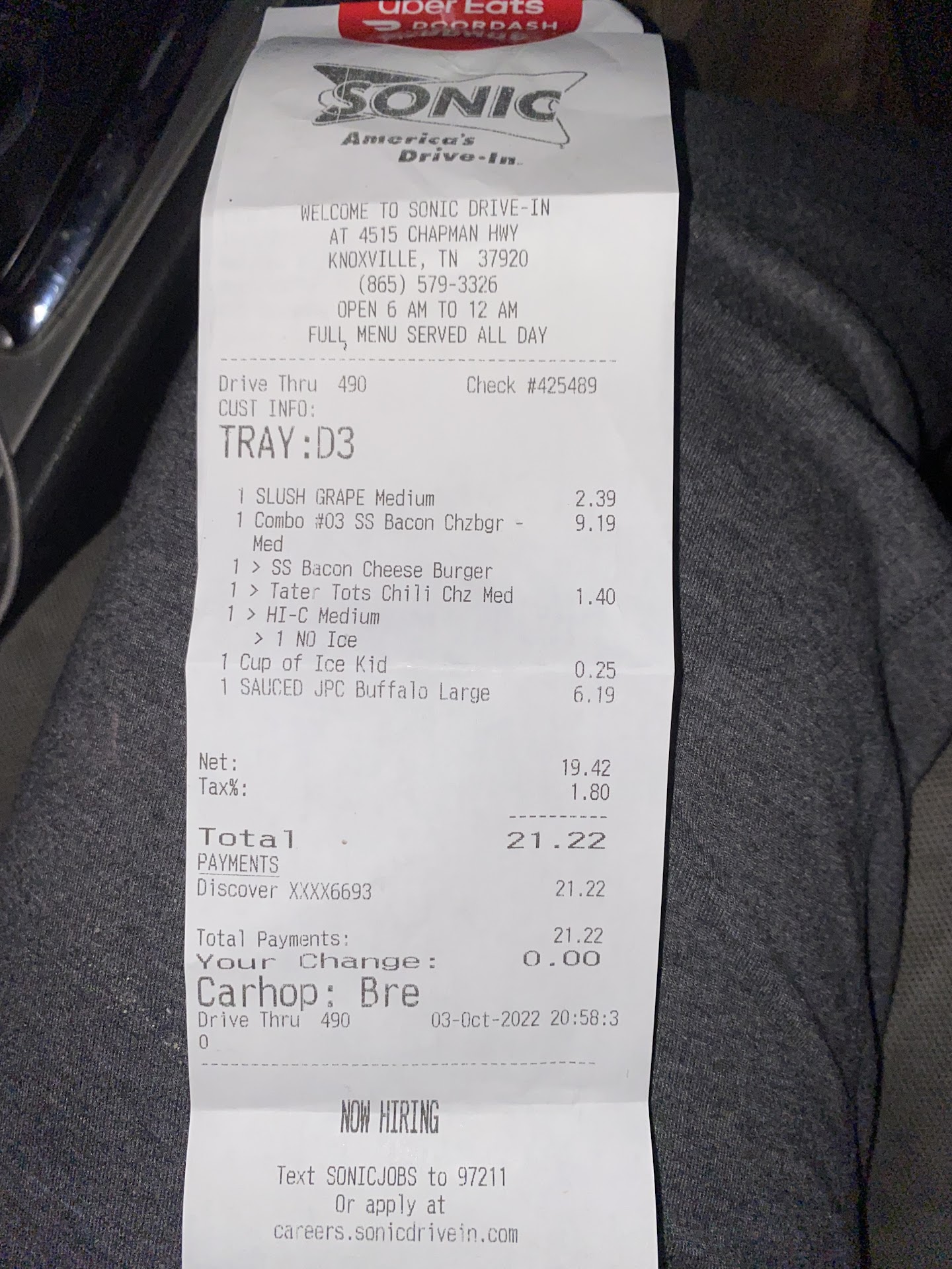 Read moreWe rarely ever go to this particular Sonic, only because our order is always messed up, or it just takes way too long. The service and servers are always polite. But that doesn’t excuse the quality. My wife and I ordered a 1. Double bacon cheeseburger 2. A grilled cheese 3. Side of tater tots 4. 5 piece cinnasnacks 5. Cherry limeade 6. Ocean water. The double bacon cheeseburger was terrible. The meat LOOKED like it had been sitting around for at least half an hour before served. And the TASTE was just dry, bland, and terrible. The TEMPERATURE of the patties and bacon, I would have never served that either. The grilled cheese, was just as bad if not worse than the cheeseburger. The bread was half toasted, the cheese was barely half melted, and even the cutting in half of the whole thing, wasn’t even cut all the way. Then when bagging it, it was just completely smashed to paper thin. The cinnasnacks, one of my favorite things, were absolutely terrible in look, and were cold inside and out.