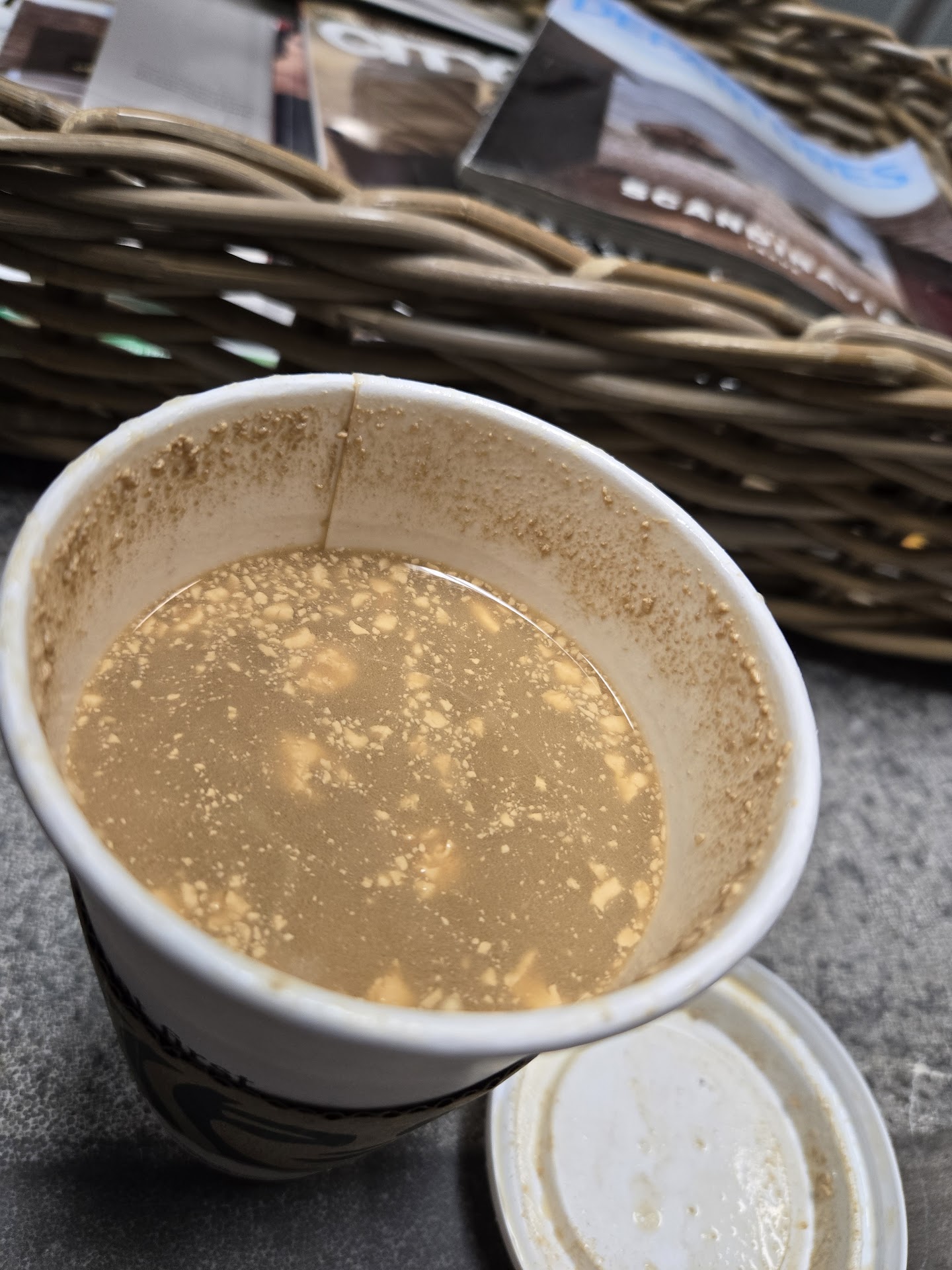 Purchased 1 brewed coffee with cream. Opened to check the temperature and discovered the cream was curdled. We went back after our appointment and they kindly gave us a new one. We checked it immediately and it looked frothy and mixed. However, when I went to drink it a few minutes later I had globs of curdled cream in my mouth. Very disgusting. Something is very wrong at...