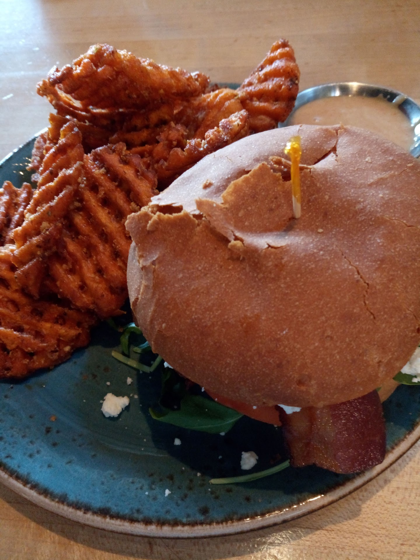 Read moreWe had a wonderful meal! I ordered the BLGT, (Bacon, Lettuce, Green Tomato) sandwich on a gluten free bun (they offer all their sandwiches on gluten free buns) and since the green tomato would've been fried in a tempura batter, on top of the traditional cornmeal breading, I was able to substitute just a regular tomato. It was so delicious!!! I had the spiced sweet potato waffle fries with honey mustard dipping sauce (seriously not your typical honey mustard) and I'll just tell you, they were made for each other. I love the fries plain though! Such a great flavor all by themselves! My husband ordered the Diablo Waffle and he loved it! He doesn't like jalapeños so he picked them off (he didn't see them in the description), but he still enjoyed the heat of the dish. Not too hot, but great combination of flavors! Our waitress, Melissa, was a jewel! She dealt with my gluten-free questions about the tomato, and was just sweet and pleasant the entire time. Food wait time wasn't long at all. The ambient temperature was pleasant (I'm super cold natured). The bathroom left a little to be desired though. It's awkward getting in because the sink is so big, and it could've used some attention, but it wasn't horrid. The worst point is the parking situation! The parking is in the back, mostly, with a few (4-6) spaces on the side. The back parking is on the hill behind the restaurant, but being on Cumberland Ave, there just isn't much they can do about it. The newly added parking garage down the street could be helpful, but I don't know for sure. The pricing is comparable to places like O'Charley's and Applebee's. Overall, we were impressed, and it's difficult to impress me. We'll...