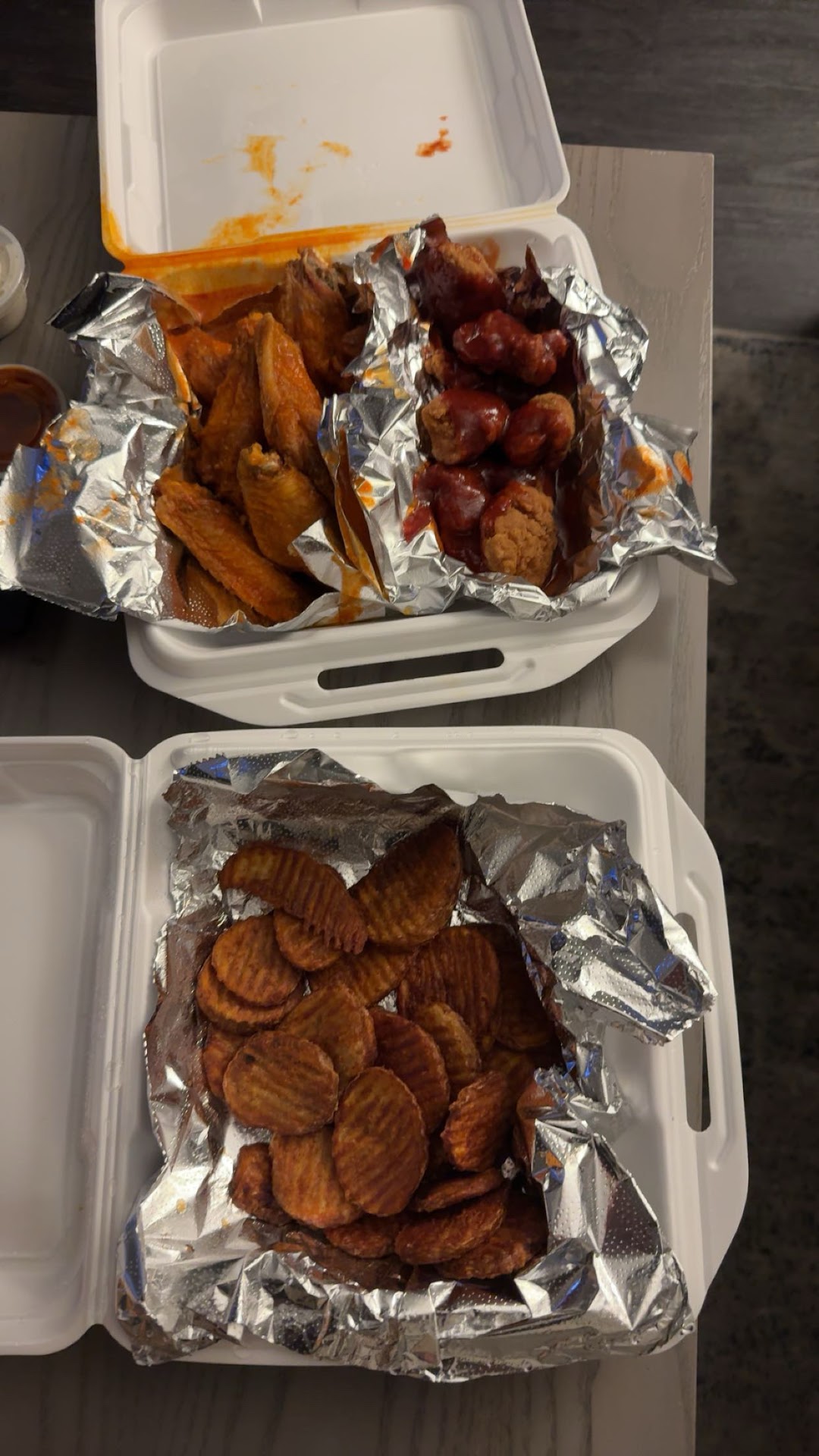 Read moreI called in an order tonight Monday 11/25 at 11:24pm, ordered a pound of buffalo garlic parm bone-in wings, a half pound of bbq bone-in wings, and onion rings. They were out of onion rings so I got buffalo chips as per the guyâs recommendation. I asked for ketchup, they told me celery was included, and I asked for one blue cheese and one ranch. They said yep got it.