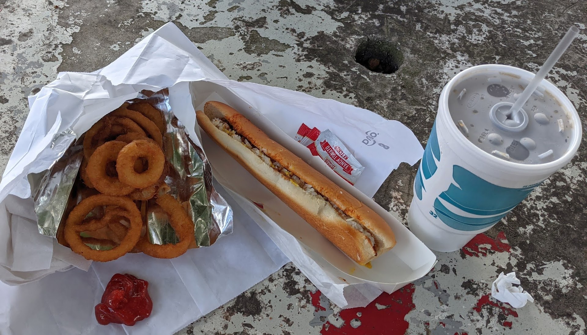 It's still the quaint little walk-up/drive-thru cash only joint with lots of nostalgia. There was only one lady working today at lunch time trying to wait on around 12 customers. I'm glad we were not in a hurry because it took a while to get our food. The prices aren't too awful bad. I got a footlong hotdog, large onion rings, and large diet coke for $10.75. My mother got a footlong hotdog, small fries, small coke, and small chocolate malt for $11.15.