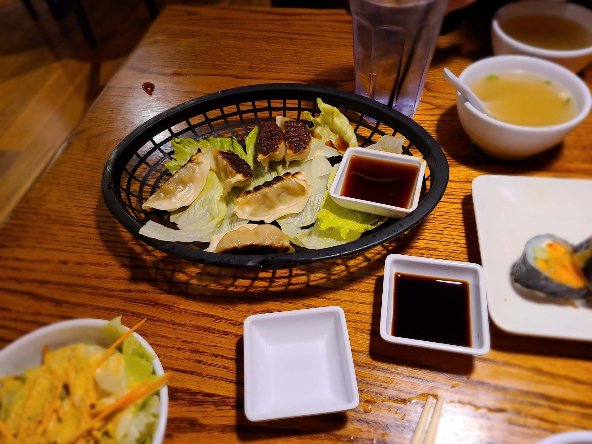 It feels sacrilegious to write a less than stellar review for what was, at one time, one of my favorite 'nicer' restaurants in Knoxville, but... here we are. My fiance and I visited Saturday night for his birthday dinner. It was a full hour before closing and on a night when the restaurant doesn't even open until 5pm. I mention these 2 things because I'm aware of the strain 'late comers' can put on a restaurant full of employees who've been through it all day and just want to get home. This wasn't one of those times. To begin, we've seen the show many times and it's enjoyable, but we were there for the food so we opted to sit at a table. As we were walking in, someone from the staff came flying through the door and nearly ran us over (I say staff because she was dressed in black, holding an apron in her hands). I anticipated some type of quick 'oops' or 'excuse me' or even a 'uh oh' face as she proceeded out the second set of doors but she never slowed down or gave any acknowledgement that she nearly ran over 2 customers. That was a shame and bad manners, but.. cool. Things happen and we let it go. Then, we waited at the empty host stand until who I assume was a manager noticed us and told us it was open seating in the front.. again without much warmth or welcome, but... Once again, cool... He was clearly having to cover for someone else in the moment. No big deal. After we sat down, decided what we wanted and placed our order, we assumed all the 'bad', thoughtless behavior was behind us. We were wrong... Lol. We ordered gyoza and the Jalapeño Roll to start and both dishes, as they came out, showed even further examples of a lack of care in this location. Our gyoza was served on a few scraps of lettuce in a plastic serving basket...sauce sloshing everywhere. The type you may see cloth wrapped bread served in... And they were definitely burnt. At this point, we're really getting the feeling this restaurant must not be doing so well. Repeated examples of carelessness and thoughtlessness. To their credit, the gyoza was still edible, so we didn't feel the need to send anything back or trouble any of the staff to make corrections. We just noted it as something else that was off about the place. I mentioned we got the Jalapeño Roll and it, too, tasted just fine.. good even...but lol.. the theme of 'no one here gives a s* about making this a positive experience for their guests' continued when I noticed that the wasabi and pickled ginger were crusted over and dry on the plate - clearly the sushi plates are preloaded with those ingredients to save the chefs time, which I don't mind, but come ON! You have to at least kinda freshen it up a bit if it looks like it's been sitting out for 4 days straight! You should not serve people food items that don't look fresh. Again, though... We're considering the time now that it's nearing when they'll close and we know the less than appealing 'look' of the items doesn't mean much beyond showing that continuing lack of care, so... We kept it moving. Our soup, salad, and entrees were fine, seemed fresh (which was pleasantly surprising given how many crazy oversights we'd already seen), and they tasted great. My last 'hurrumph' came as I was asking the waiter for shrimp sauce to go. I made the mistake of including the question to my fiance so he'd get a chance to ask for some as well, but once the waiter's attention shifted to him, my original beginning of a request was forgotten, so I decided to just make use of the leftover sauce still on our table. However, the bussers came through hurriedly and stacked our plates together as soon as we'd put our leftovers into boxes, so my container of shrimp sauce got mushed together by the empty sauce containers on the table before I had a chance to add the sauce to my food. This was not the ending to the unpleasant experience I was hoping for, but it was certainly the ending I expected. Our next visit will be to a different location in hopes that the staff there still have a little pride in their work, but I gotta tell you... I'm not...