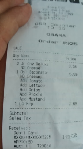 Read moreSo me and my husband are truck drivers that we came through there to get a quick lunch as you can see on my receipt what I ordered but what I actually received was all the dressings for a Baconator but no but when I told him it was wrong they took it back there and swore up and down and said no bun but you can clearly see Miss Suzanne took my order correctly I brought it to the manager's attention to tell her that it didn't say no but it just said no cheese so they took it back to remake it when they brought me my hamburger I checked it and it was wrong it had no mail on it and no ketchup on it when I told the manager that it was wrong again her reply was if I take it back I have to throw it away let me give you mayonnaise and a pack of ketchup and you can put it on...