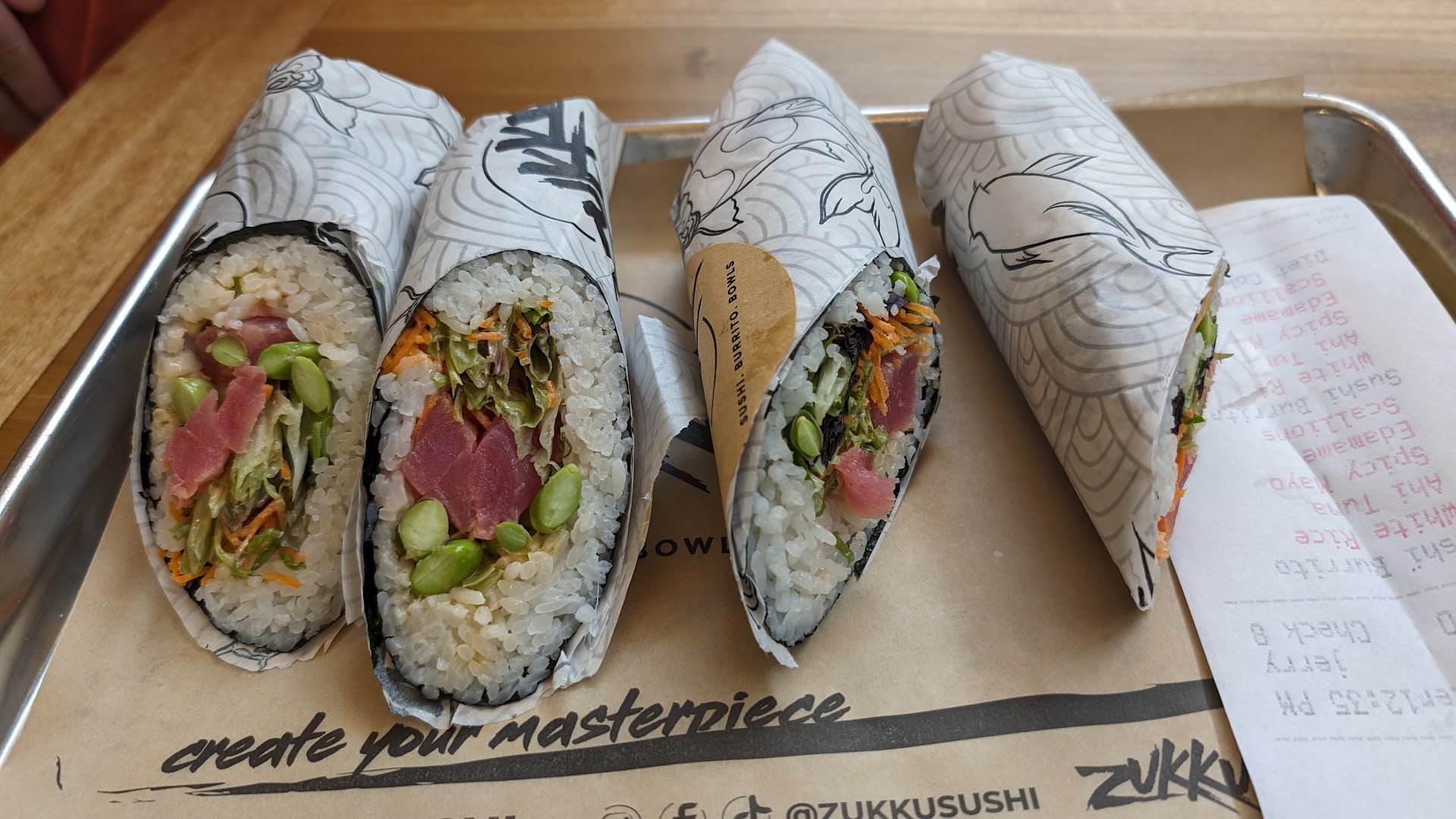 Would NOT recommend. Look at the Pictures. We've Probably spent over $350.00 on this place, and all four times were Disappointing. The first time my Husband and I went, the "Miso Soup" had hard Rocks in it... Turns out after attempting to eat it, we asked and learned that it was FRIED TOFU. Barf. There was no green onions in it and it was SO SALTY when we took it back the Dude there gave us Spring Rolls instead.... After trying it himself, he concurred with me. The spring rolls are VERY Small. Like Literally the Size of my Pinky. Not worth the Money when you only get 3 and spend like $6.00. Now... the best, or what for us- was actually the Worst Part... The Sushi. The first time we came they did "Okay" on the Cream cheese. Not great, but "ehhh Okay..." The second time was Bad. The Third time was not so good (and this is after I told them "Please, I love cream cheese" (LOL) and the Fourth time was just the straw that broke the Camels back for me. SO Bad. My Husband was sent to get the sushi alone, this time. He told me that they were rude with him when he had told everyone that it was "To-Go" instead of "for here", and they were pretty much huffing and puffing when they threw it in the Box. He said he was nice as possible but since he talks with a Russian accent, they felt the need to talk to Him however they pleased. Which is NOT okay. My Husbands English is good, and there's no reason why they have to talk to Him like he's an animal, and make him wait 40 minutes for food. No respect for your customers is NOT acceptable. So I would say the atmosphere is a bit off. Also for being in the kerns food hall, that's like the only thing they have going for them. The staff is rude, the sushi is overly hyped for BAD sushi and it takes forever for your "Masterpiece" to come out. And when it does, your expectations are flattened and destroyed into chaos all over a box bigger than your Bill. Go somewhere else.
