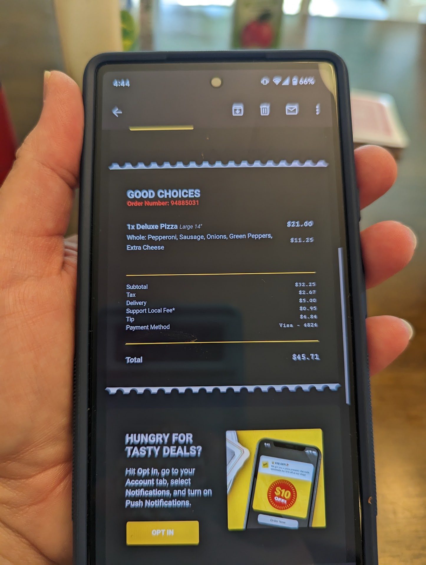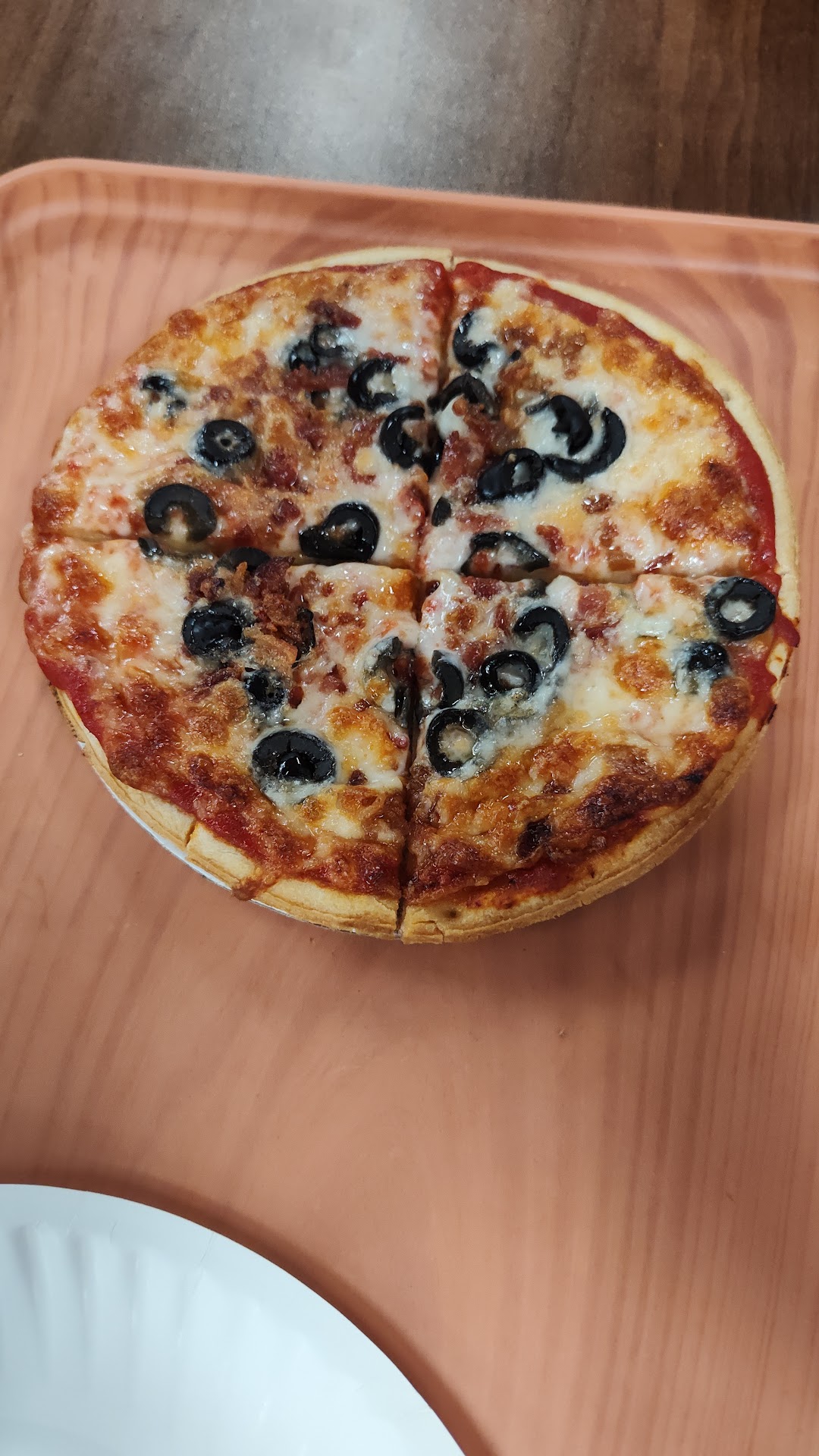 We brought the pizza home (in a bag?! no boxes?!), but didn't eat it. We wound up stopping somewhere else for lunch.