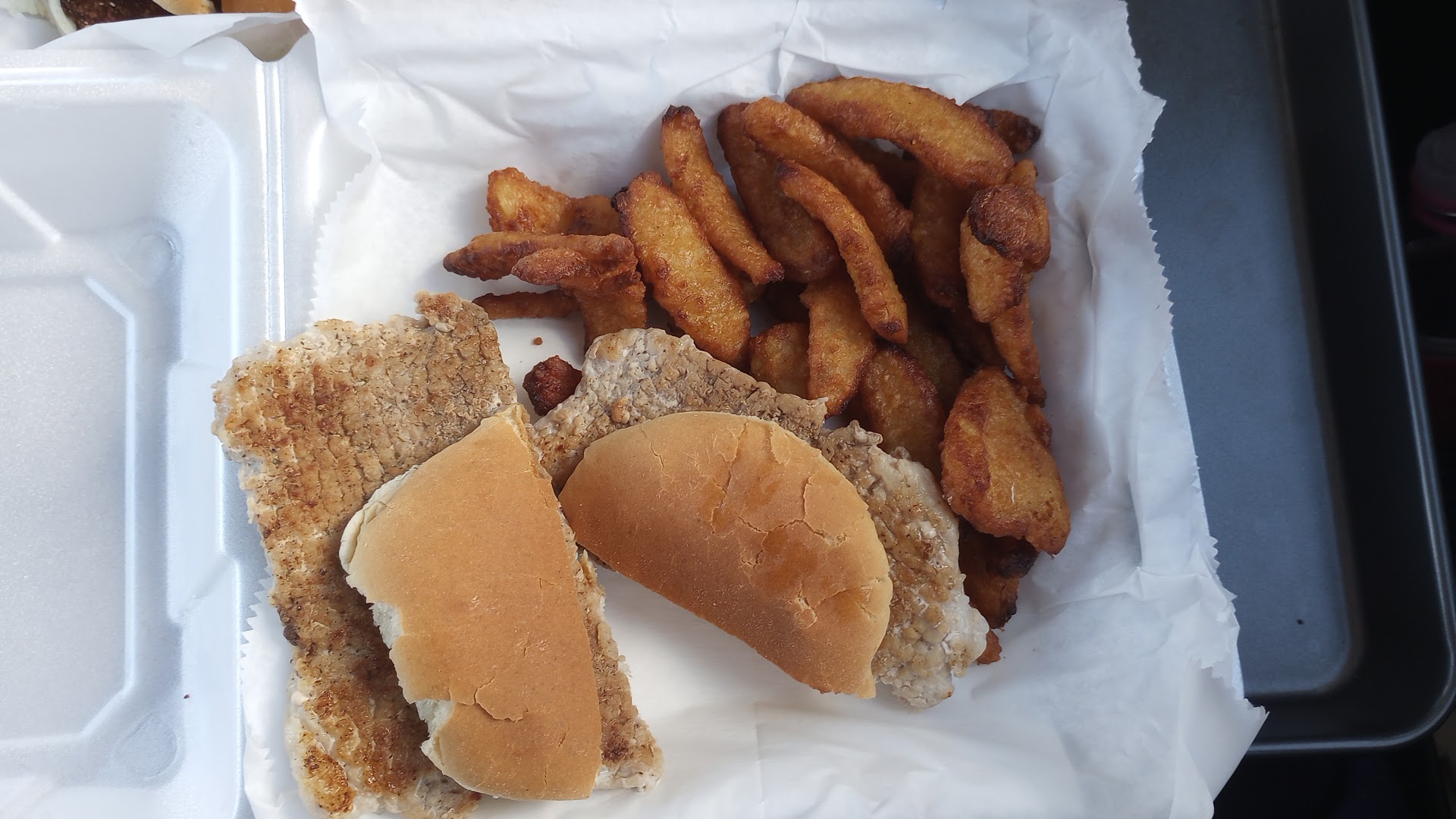 Ā Ā Ā Read morethe grilled tenderloin was thick and moist with light seasoning. could have had the fat trimmed off it. but it was very good. the breaded tenderloin was also thick had a nicely seasoned crispy crust unfortunately was over fried and dried out. onion chips are also over fried and very greasy. would have been excellent if crispy. bit soggy. unfortunately still using styrofoam instead of something compostable...