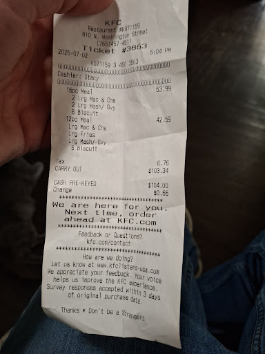 Read moreWhat a joke, tried both stores neither one would sell me a bucket of chicken so I could feed my family, the south store told me they had no bucket deals at the moment, so I called the north store, the manager told me he has buckets all day everyday, however he was running low on chicken, I asked how long would it be before he had chicken up, he said 20 minutes. I SAID COOL I WILL WAIT, I get there within 10 minutes proceeded to order, the manager hollers up to the cashier tells him/ us he will not have chicken for 45 minutes, I said what I just called you you told me 20 minutes, he said I already sold all of that chicken, mind you it has not even been 20 minutes, he straight lied, gasoline is 5 bucks a gallon, i just drove all the way across town and this guy doesnt think I should have an attitude, time out, here I am watching people get smaller orders of the exact same chicken he wouldn't sell to me after he told me he would have chicken, yes sir I am a little mad, then the guy asks me If I would like to do his job, well , now I believe he doesnt need that job! Kokomo store on north Washington street, he refused to give me the store number so that I could make a formal complaint! I went home with nothing for the...