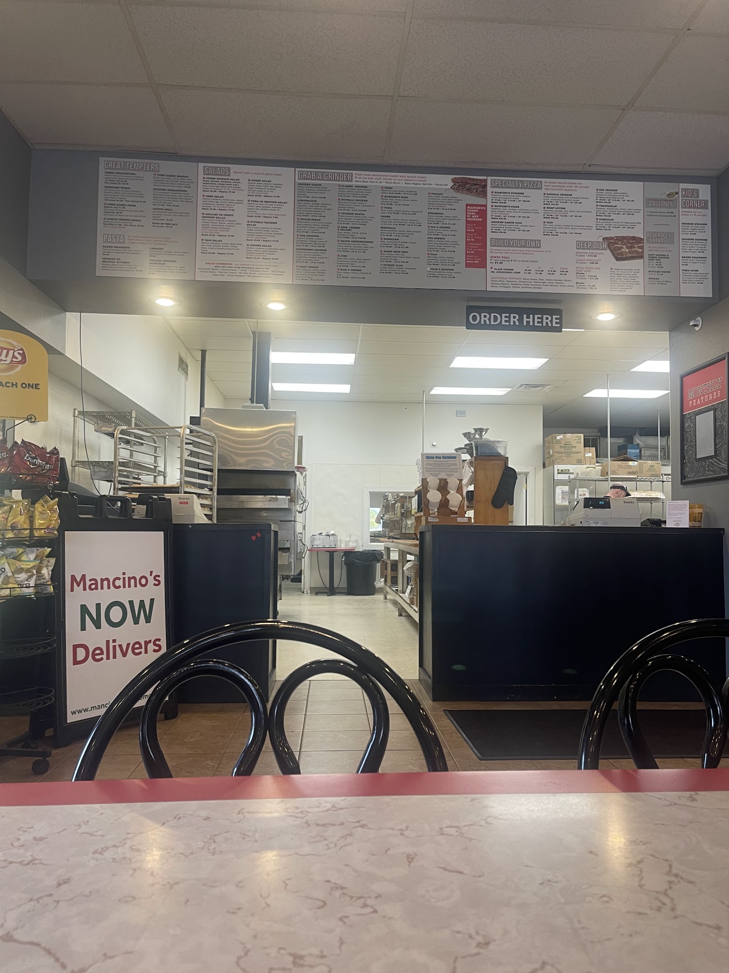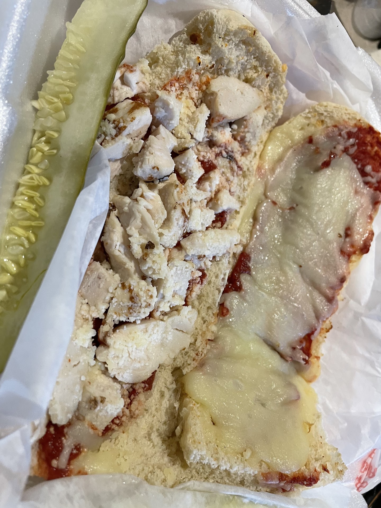 The food was hot and cheese was gooey. I had the chicken parm sandwich - sorry āGrinderā - and it had nice chunks of chicken, and the whole thing was HUGE! I looked up Penn Station and I was surprised their biggest sandwich is 12ā long (subway too) and it costs more than this, and this was a monster 16ā!!!! And cost less!!! With scratch made fresh bread on top of all that! Yeah, Iām freakin out a little over a sandwich - uh I mean GRINDER - but Iām a super fan now of Mancinoās, thatās all I can say!!! And the breadstickā¦so good but I took most of it home because it was so much.