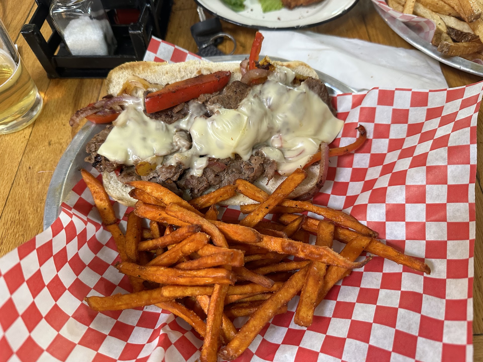 The restaurant itself is very cute. Loved the outside patio. They have a lil playground for kids and a corn hole set up. However, the bartender and server wasn't very friendly. We walked up to the bar because it looked empty, the bartender immediately said "there are 2 ladies sitting there and they went out for a smoke". No, hey guys or hi just want to let you know those seats are taken but there are tables behind you that you can sit at. I've been a bartender for over 20yrs and you're supposed to make people feel welcome so they go back. . The server was ok. But she barely spoke more that a few words to us each time she was at our table. She didn't bring napkins or silverware with our food. And when I order a spicy margarita, she ordered the specialty drink that was on the drink menu, which was ridiculously hot, like unbearable. Plus, it was made with vodka. I asked for a tequila spicy margarita and I def didn't get that. And when I told the server it was too hot and I even apologized because I have not ever sent a drink back she didn't even apologize or offer to get me a new one. She just looked and me and stood there like she didn't know how to talk. . We order fish and chips. The fish batter was too thick and not even cooked all the way, it was cakey inside. We didn't even finish out food. The beer we order came in a lil tiny glass, um where was the punt glass of beer lol. Anyway, unfortunately we will not be returning to this place. But we do hope whoever goes there gets better service and better...