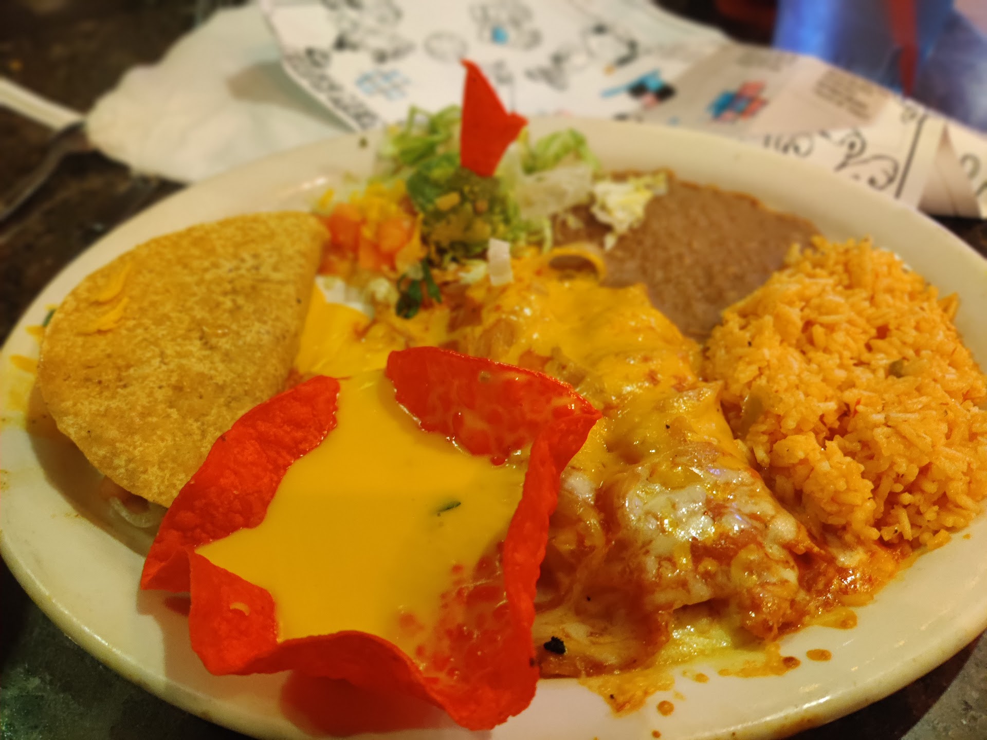 The waitress who took our drink order took the initiative to serve us ..kudos to her. She might be the only shining star there. Our food finally arrived about 20 mins later. They offer breakfast all day...my daughter ordered pancakes, rock hard. They tasted like they were made in the morning and maybe microwaved. I ordered a plate with enchiladas and a crispy taco...Yea, maybe crispy one side taco. Somehow one side got stuck to the plate...if you look at the pic, one side was wet and mushy, and the other side was the crispy part. So the food was no saving grace here