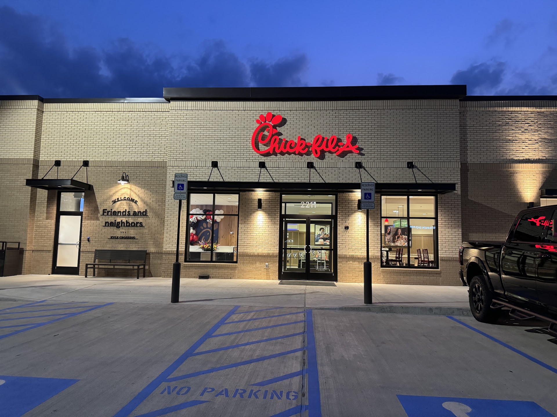 âââââ 8/ 7 /2025 My wife and I stopped by the Chick-fil-A at Kyle Crossing, and from the moment we walked in, we were impressed. The employees here are some of the friendliest weâve ever metâevery interaction was warm, genuine, and made us feel welcome. The âFriends and Neighborsâ message on the wall and fun âTha Cowz Welcome Youâ touches around the restaurant really add to the inviting atmosphere. Itâs clear this location takes pride in creating a positive environment for its customers.