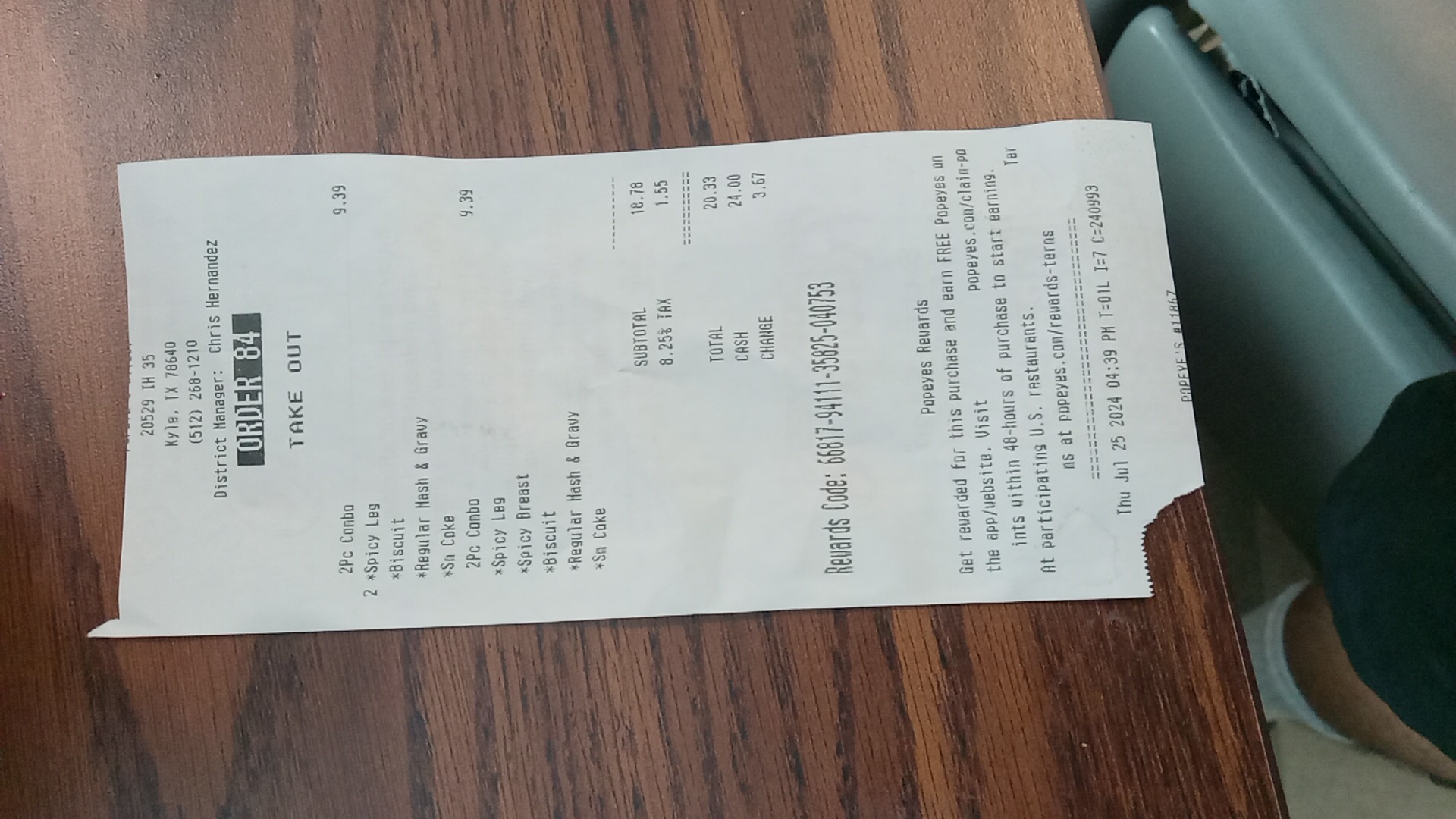 Read moreWe had a taste for fried chicken and biscuits. So we went to the KYLE, TX, Popeyes Louisiana Kitchen. I asked the young lady taking the order if we could get more than the 5-piece Strips, she offered a deal on a 9-piece regular strips special, but asked if it was OK for us to wait for about 10 minutes to prepare them fresh. We agreed. We were asked to pull around to the door to receive our order, which we did.