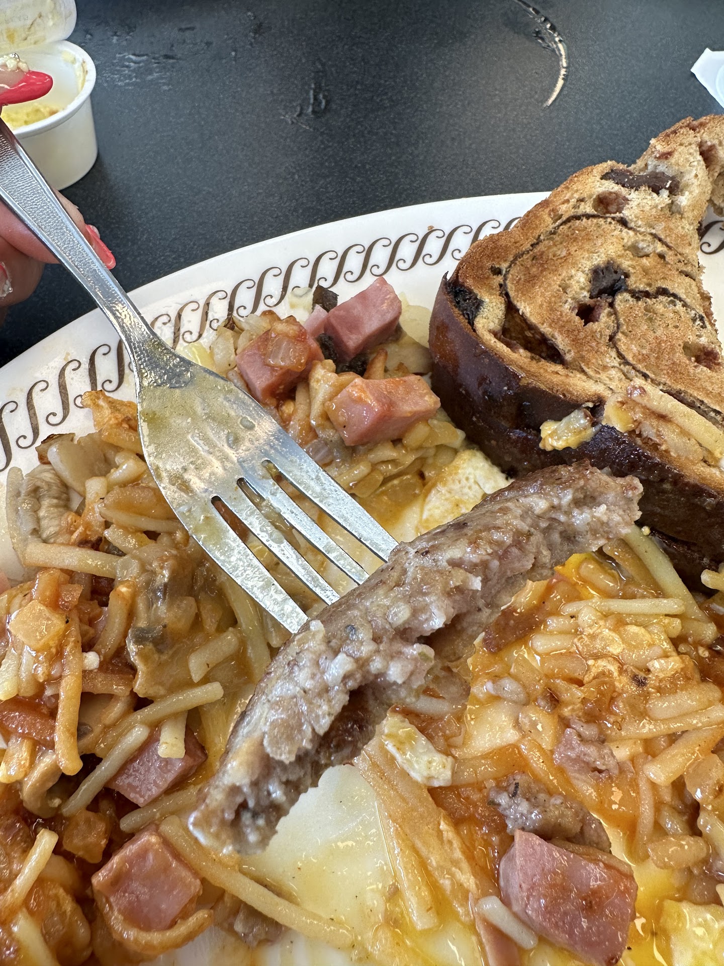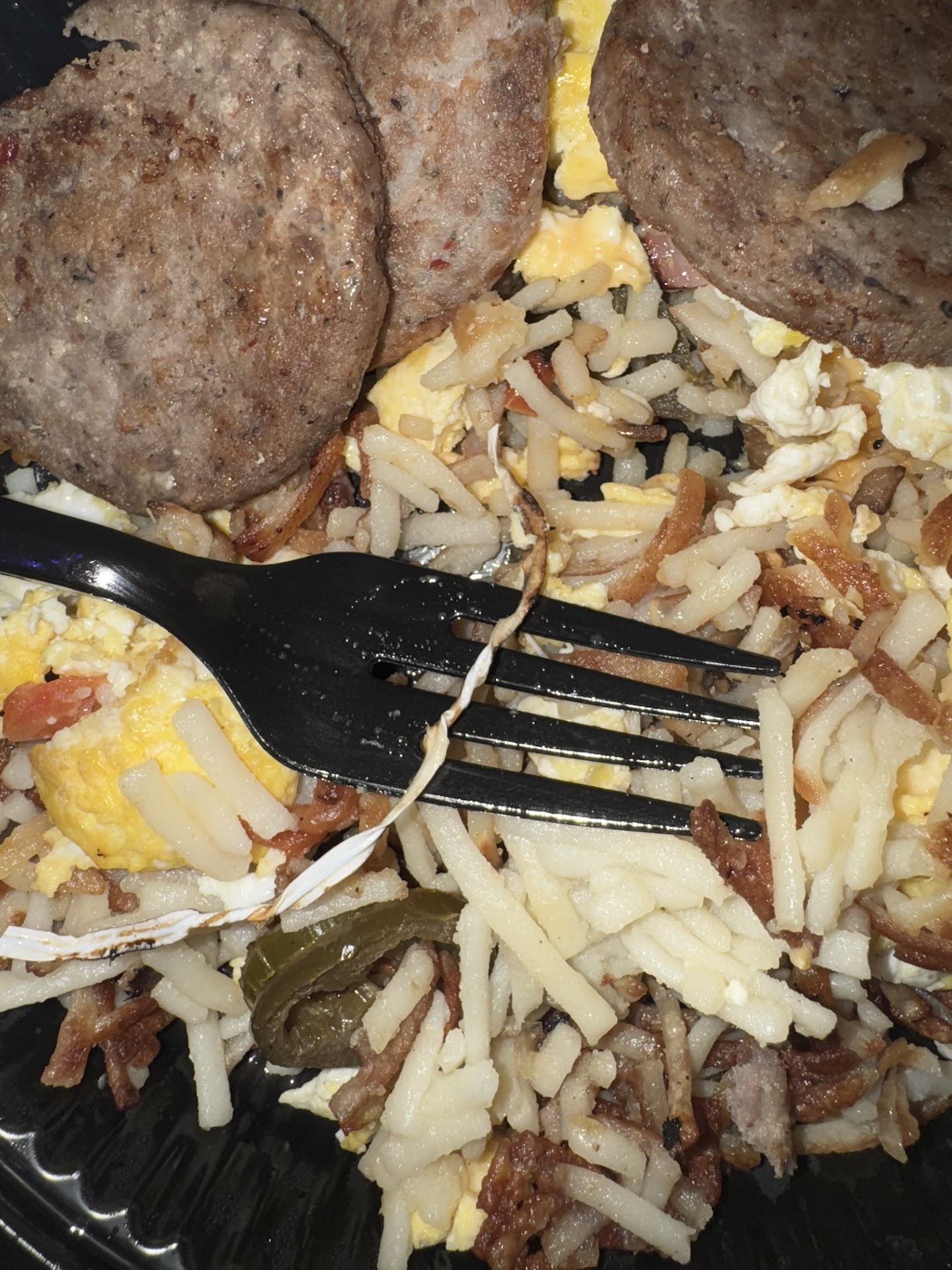 To top that, I initially walked out with my order which turned out to be wrong. It was missing the protein and the cheese on my scrambled eggs. I did not mind, went back inside and the waitresses had it fixed within a few minutes. What did upset me is what I found in my food when I got home. The pictures are attached. Had the grill master paid a little more attention to the grill instead of yelling constantly, I probably wouldnāt have almost swallowed a bread tie.
