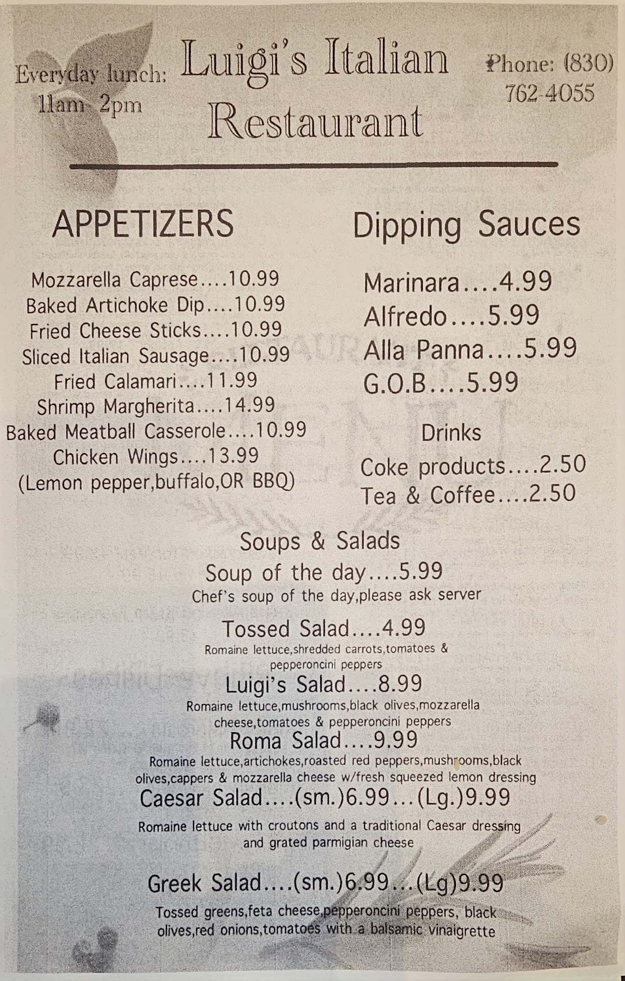 Ā Ā Ā Read morePreviously at their Castroville location, Luigiās was my absolute favorite place in Castroville, so I would make the drive a few times a year. However, today, my boyfriend and I visited the new location (since they opened in January 2025), and the food was ok. I got my regular (fettuccine Alfredo with chicken) however, the pasta and chicken was very bland. Chicken had absolutely no seasoning. No amount of salt or Parmesan cheese could add flavor to it. My boyfriend got the Stromboli, he didnāt enjoy it much due to the amount of grease and cheese that it had. We did enjoy the garlic knots and the sliced sausage appetizer. The owner has always been friendly & the servers. Plus, this new location has a working AC. Price wise: We ordered 1 fettuccine Alfredo with chicken, 1 Stromboli, 1 small Caesar salad, 1 order of sliced sausage, 1 lemonade, 1 Dr. Pepper came out to a total of $60. (With tip)