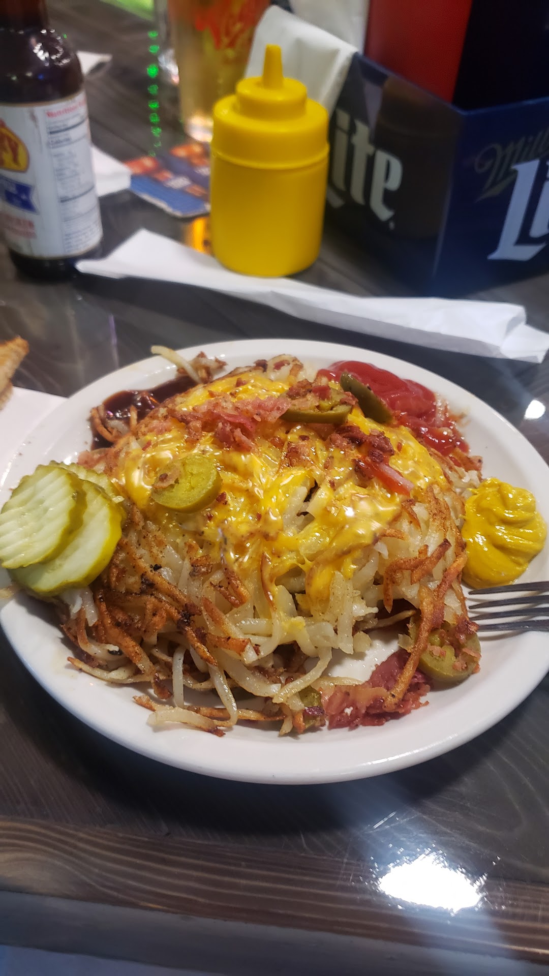 I'd never had their legendary flash burger before, but after one try I was hooked. It's a delicious meal that includes mushrooms, green peppers, onions and jalapeños put on top and mixed into hashbrowns. Those hashbrowns are then placed on top of a seared hamburger patty. It's all served with toast and pickles. I encourage people to have the veggies cooked as it adds just a bit more flavor.