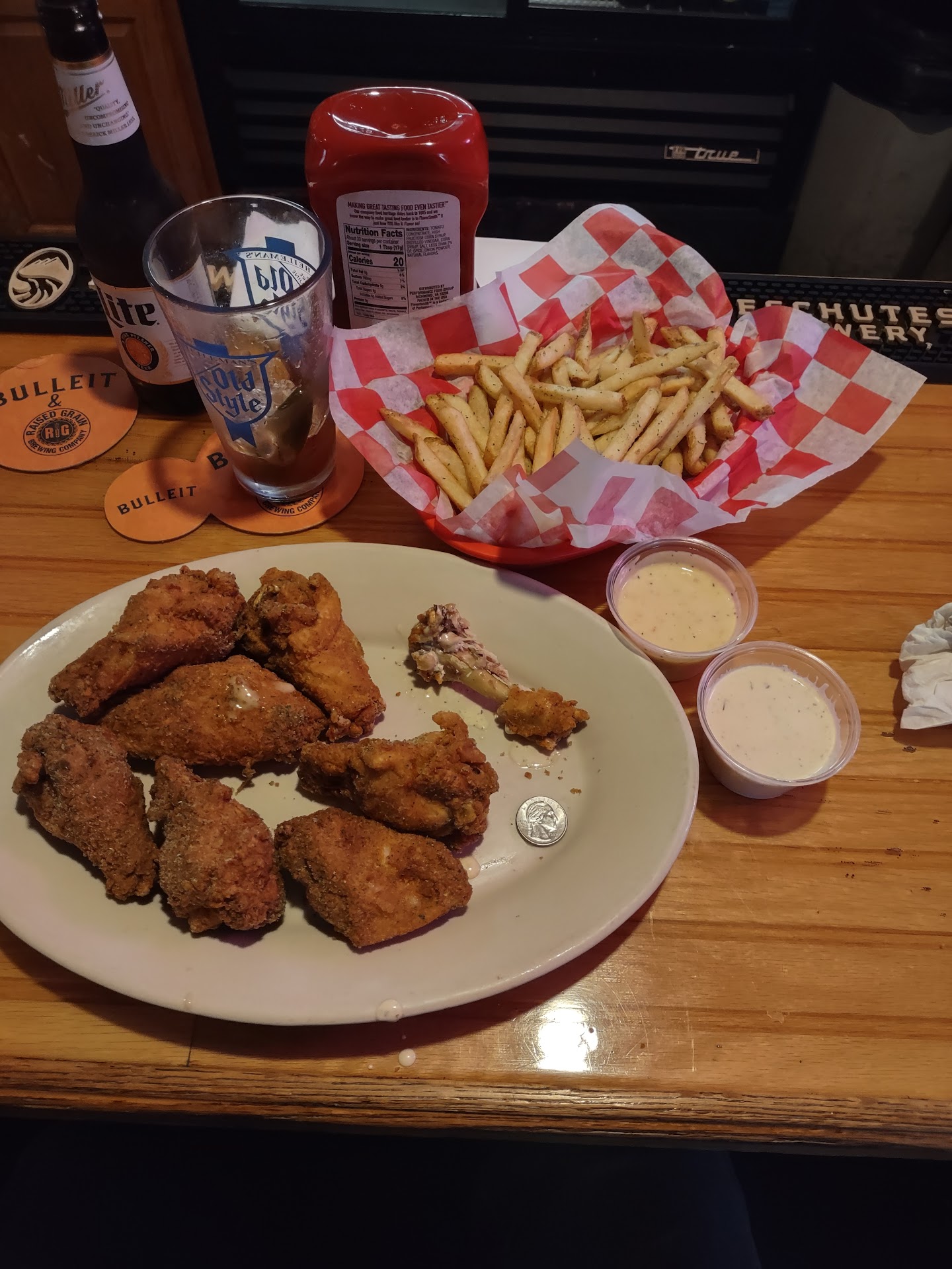 Second time coming here, didn't disappoint. Neighborhood type of bar/pub. Mike was running the place and he recommended the wings, they where huge and amazing. Tried two sauces, the Garlic Parmesan and the White Hot. Both where excellent, the white hot was very tasty, but definitely got hot a few seconds after dipping. So good though. The Garlic Parmesan very good and seasoned perfectly. The Fries, just how I like them, fresh cut and perfectly cooked and seasoned just right.. Second experience was great, definitely coming back for a round three. Side note, Mike was the third associate I have encountered here, all where great. Outgoing, friendly and professional. Lily, Alex, and now Mike for the win! Thanks for the hospitality. Chicago Dave The wings are huge!!! Quarter for size comparison, couldn't eat them...