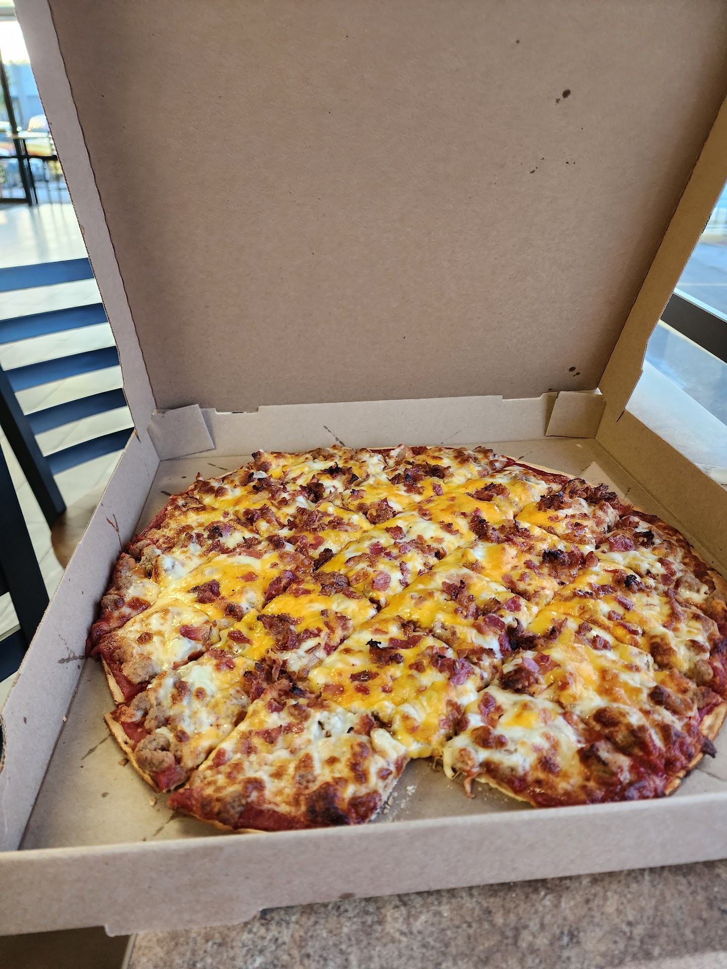 I recommend this place and will go back for sure. The one thing holding it back from being a 5 or even a 6 star place is the sauce. It needs work. Like...canned tomato paste mixed with canned pureed tomatoes and not much more I am guessing. This was masked on the Terry's pie by its awesome flavorful sausage and the sprinkle of oregano but it really stuck out on the hand tossed bacon pizza. Which was a shame with how great the crust was.