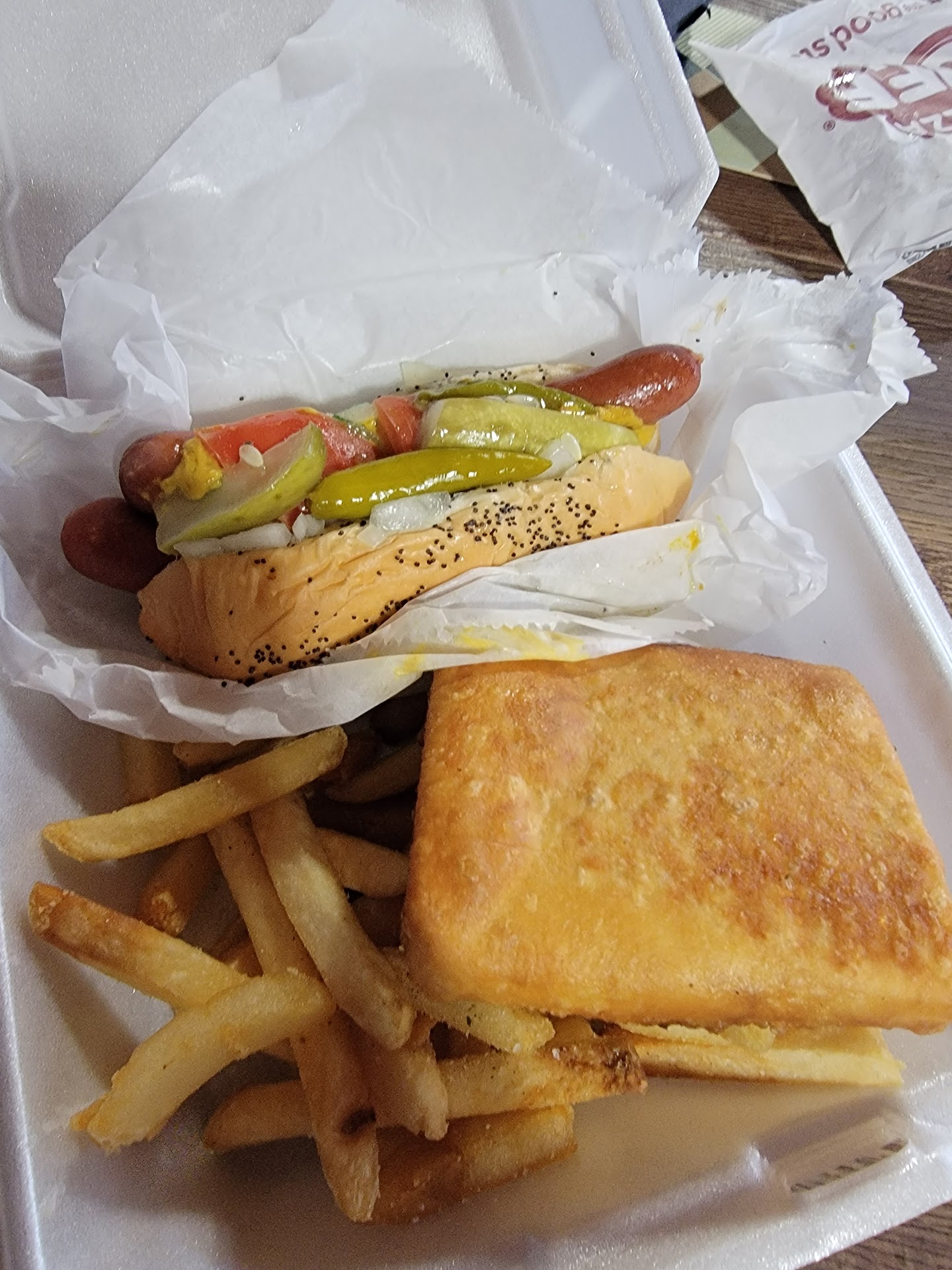 Read moreI wanted to leave a review but then I forgot I could take a photo… ate my food so fast. Just the right touch on the Chicago dog of spice (I’m not a fan of spice normally). The gentleman that usually is here was here again today and he was so patient and kind with my kids and their specific orders. He was also funny and made us leave with big smiles on our faces. He made 4 sandwiches quickly and they came out perfectly, not messy or underdone. Every time I come here or order from here we know what to expect as far as our food goes. He is consistent in the way he makes food to orders. Really grateful for this place and...
