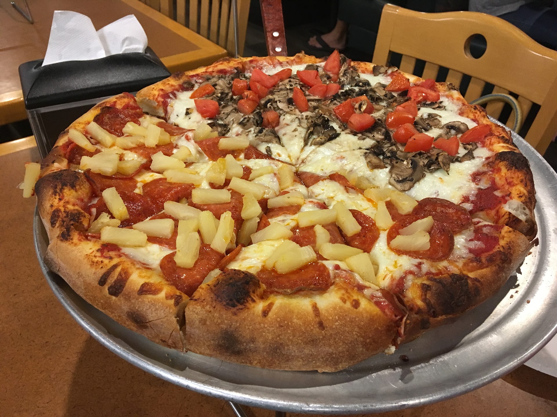 I was so surprised how clean it was which is a big plus but the climax is the pizza and we got half pepperoni, pineapple & mushroom with tomato. The crust was properly cooked with no burnt edges and it didn't have excess flour at the bottom. The tomato sauce was very salty but the cheese wasn't greasy and when you bite into the pizza it taste almost like Pizza Hut! The sauce taste very tangy and salty like Pizza Hut, the cheese and pepperoni were the ingredients that set it apart from Pizza Hut.