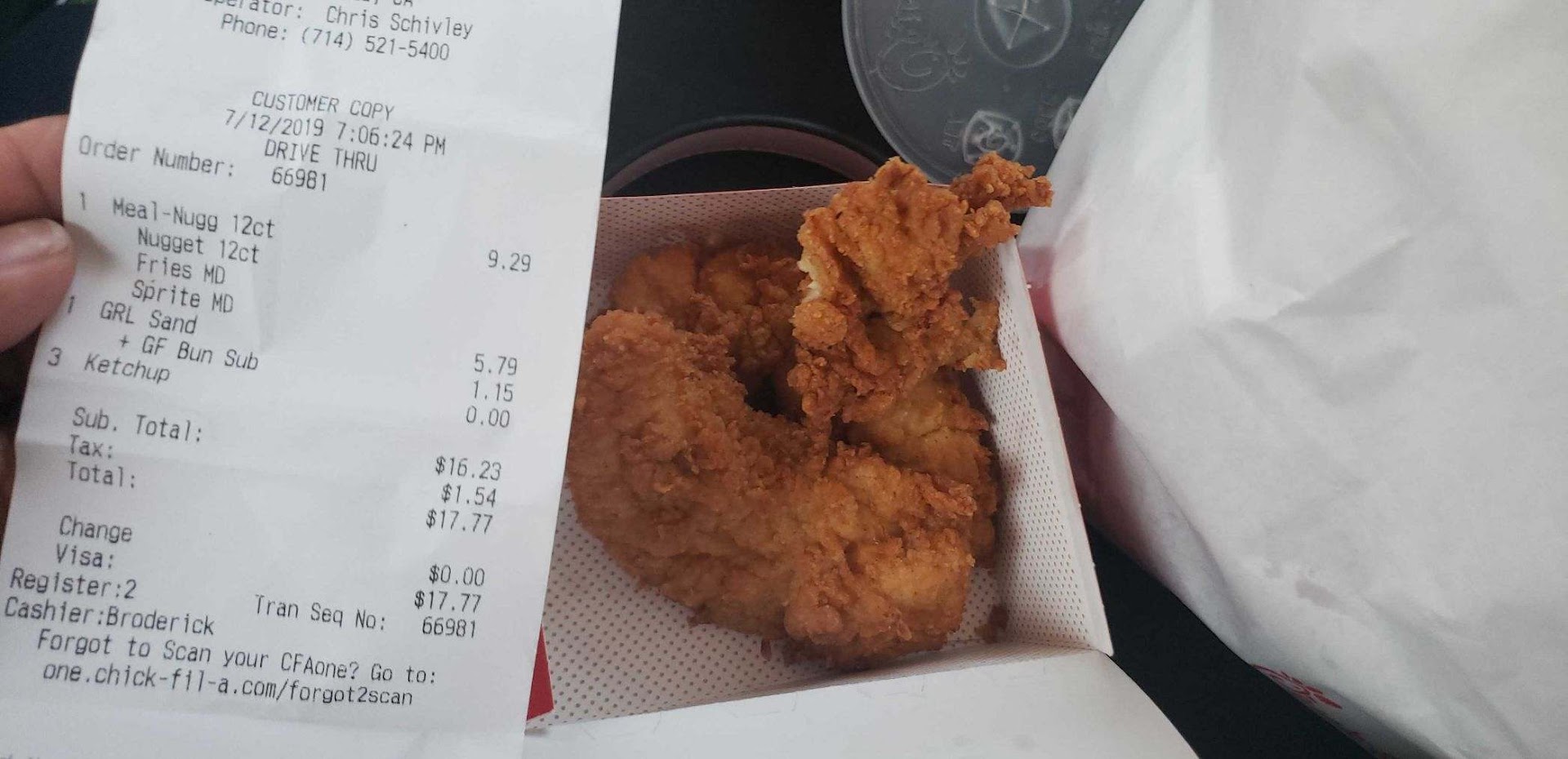 Read moreFirst, let me start off by saying that I don't even like Chick-fil-A. But I needed something on my stomach. I order my food in the drive thru. Why do they have their employees out in the cold taking orders and taking your money? When I told the girl taking my card that at McDonald's they have a closet of jackets that employees can borrow during their shift, she replied, so does In-N'Out. Then she said she had to pay for a Chick-fil-A jacket. Thats kinda janky, but I digress. So I drive off after ordering nuggets. Matt repeated my order and announced my buffalo sauce. I drive off and guess what I don't have Matt...buffalo sauce. One reason I don't care for Chick-fil-A is that their food tastes like chemicals and I need the buffalo sauce to eat what they gave me. Now that I had to come back to your store, I'm going to sit in the parking lot and give you a bad review....