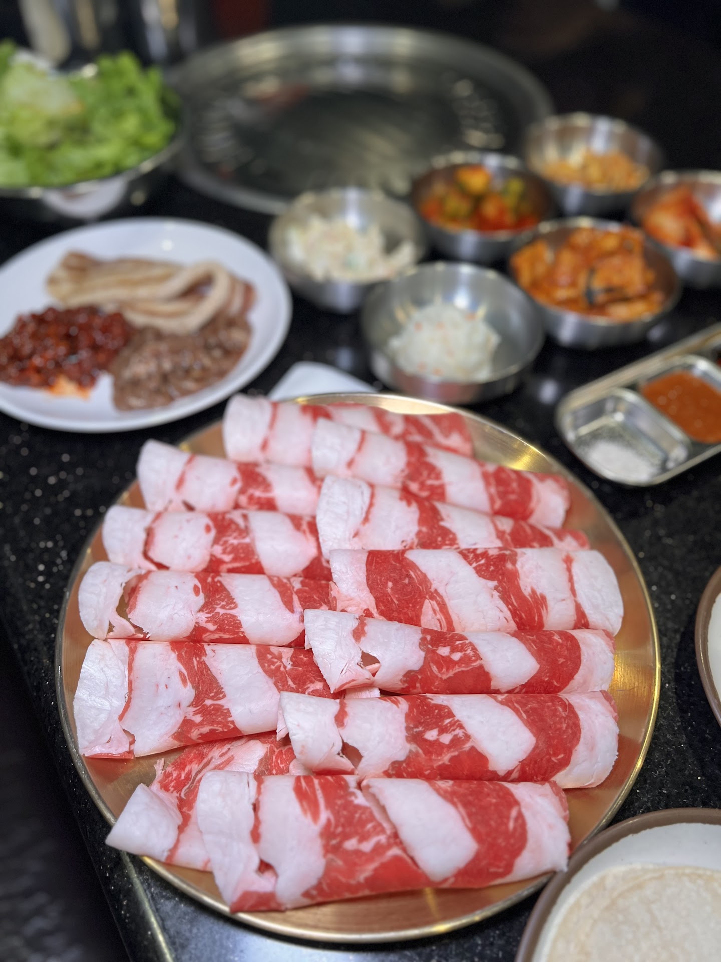 Bar: They have a self serve bar that included all the basic marinated meats. I got the spicy beef bulgogi, regular beef bulgogi, & marinated pork belly. These all tasted delicious. They also had more side dishes at the self serve bar! I got gyozas, french fries, chicken nuggets, onion rings, and tortillas! I will say these could’ve been kept warmer bc they were cold when I ate them.