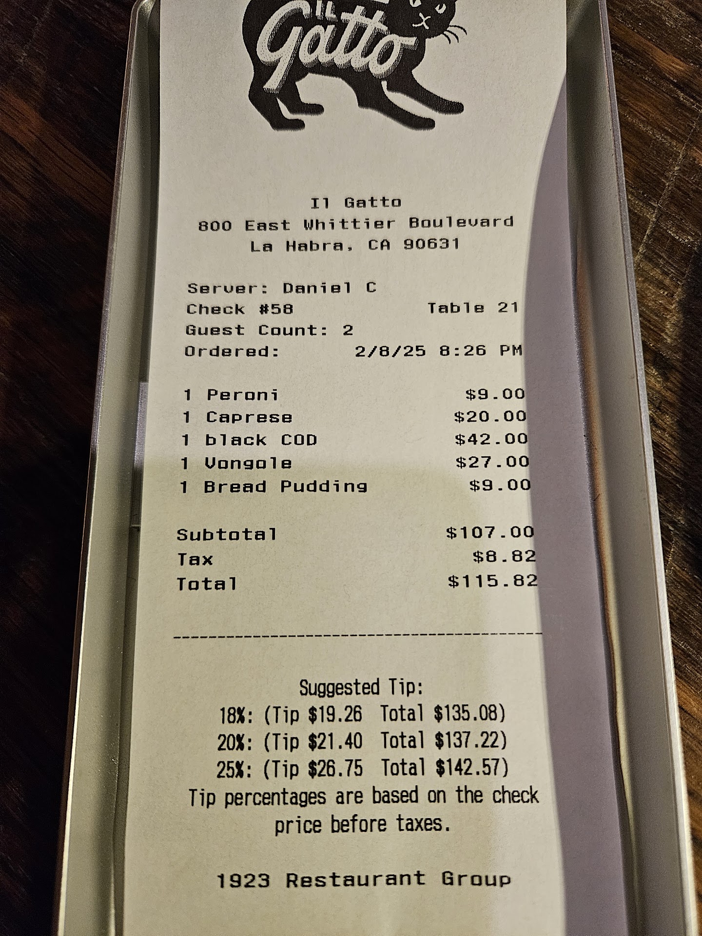 Read moreIl Gatto is the next best thing. The fresh Italian food is as authentic as ever and the service was excellent. The ambiance set the tone and was warm and inviting. This place has only been open for a month, but it sure impressed my wife and I. Our server, Teresa was the absolute best making us feel right at home. Her knowledge of the menu and recommendations was exceptional. Her positivity was contagious.