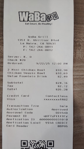 Read moreLa Habra Waba is the best of 3 that I have tried disappointed in Whittier, on Washington, and Fullerton, I made a review on both those already The one in the Habra food is always good the customer service is good especially during the day and they don't charge extra charges if you can't eat the orange they give you the vegetables and don't...