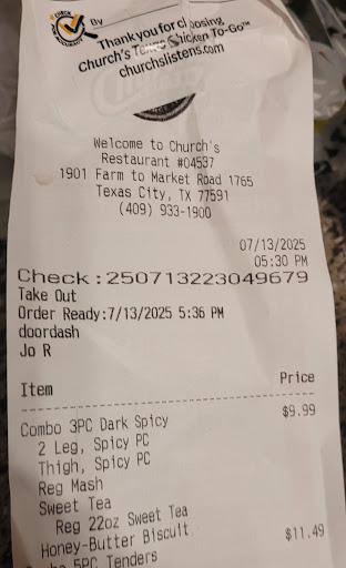 Read moreI went to pick up me a meal there, went thru the drive thru and they told me to park and they would bring my meal to me. After waiting a long time and after seeing other customers going in to pick up their order, I go in and ask 'Whrre was my order? I have been waiting. An employee then said... "Don't come in here with all that." Are you serious.... I paid for my order thru drive thru and I have to walk in to get it? Wow! Very disappointed. And am she threw my bag on the counter and proceeded to say, 'This is yours after telling me that they had to wait for fresh chicken to come up. They LIED. My chicken was old and dry. I made a complaint to the Church's Headquarters. Sorry customer service and sorry chicken. I will not give them $.01 of my money ever again! Go back to training and learn customer service...