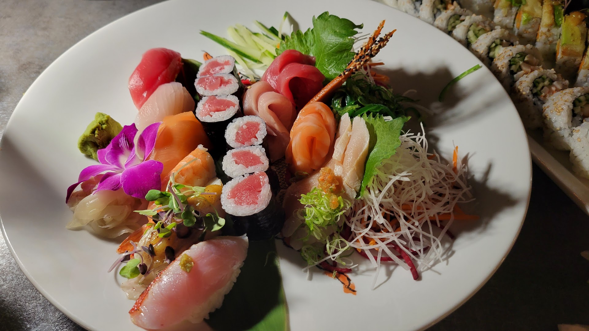 We continued onto our mains. One of our party ordered a tempura plate, which I'll touch on more later. Another a dragon roll, and again another a crunchy roll. The last item we ordered was a sushi and sashimi combo. The combo itself was beautifully plated, with some quality cuts of fish. I have no complaints about the quality or portions. However, if you're paying nearly $60 for this combo, it seems rather insulting not to be given the choice between fresh and fake wasabi. In this case, the $60 combo is served with fake wasabi. I'm at a bit of a loss why the owners would try to serve food at this price point (in La Mesa of all places), while failing to execute on some really standard things.