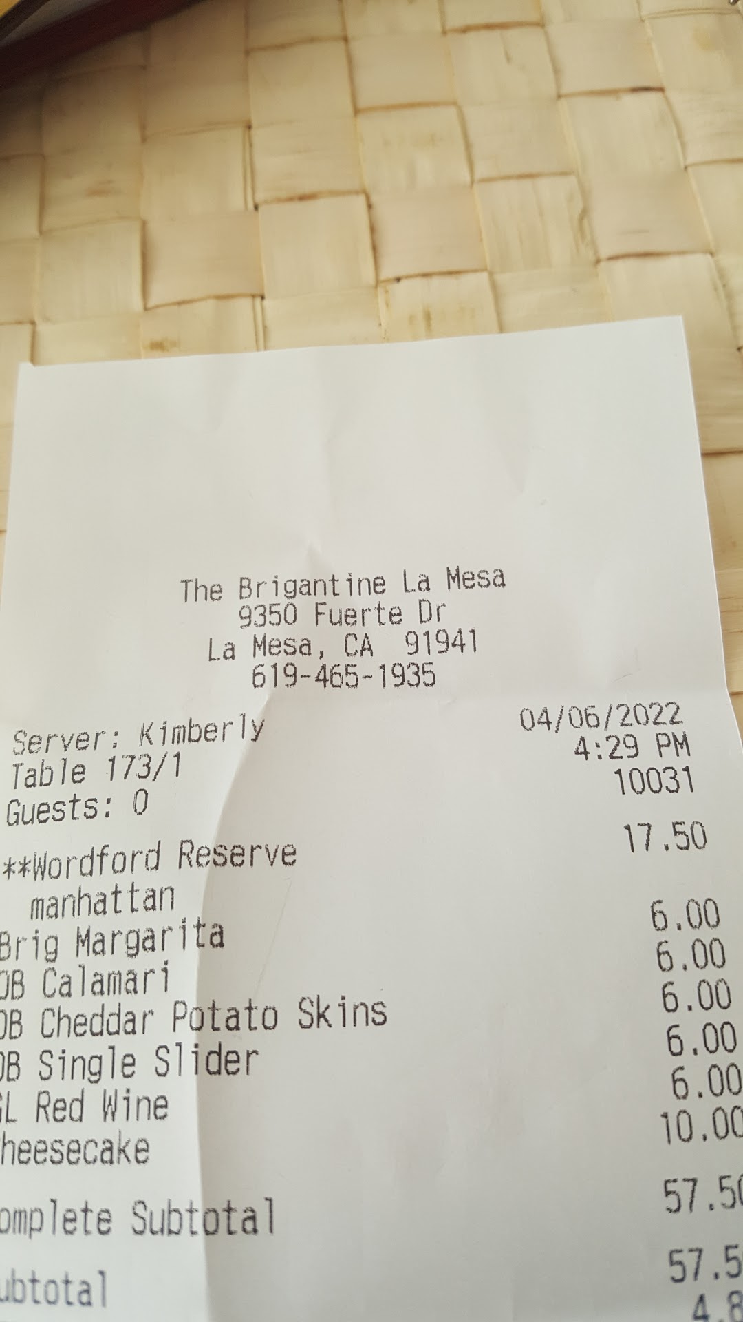 We ordered oyster shooters and again, I asked if there was a buy two for $10 or some sort of special, and our waiter said no. We had ordered 3 shooters. I know other Brigantine restaurants have this, but I didn't push it. When I examined the bill. I saw the 2 shooters for $10 and another single shooter for $6. I would have liked to have the option of ordering another shooter for an additional $4.