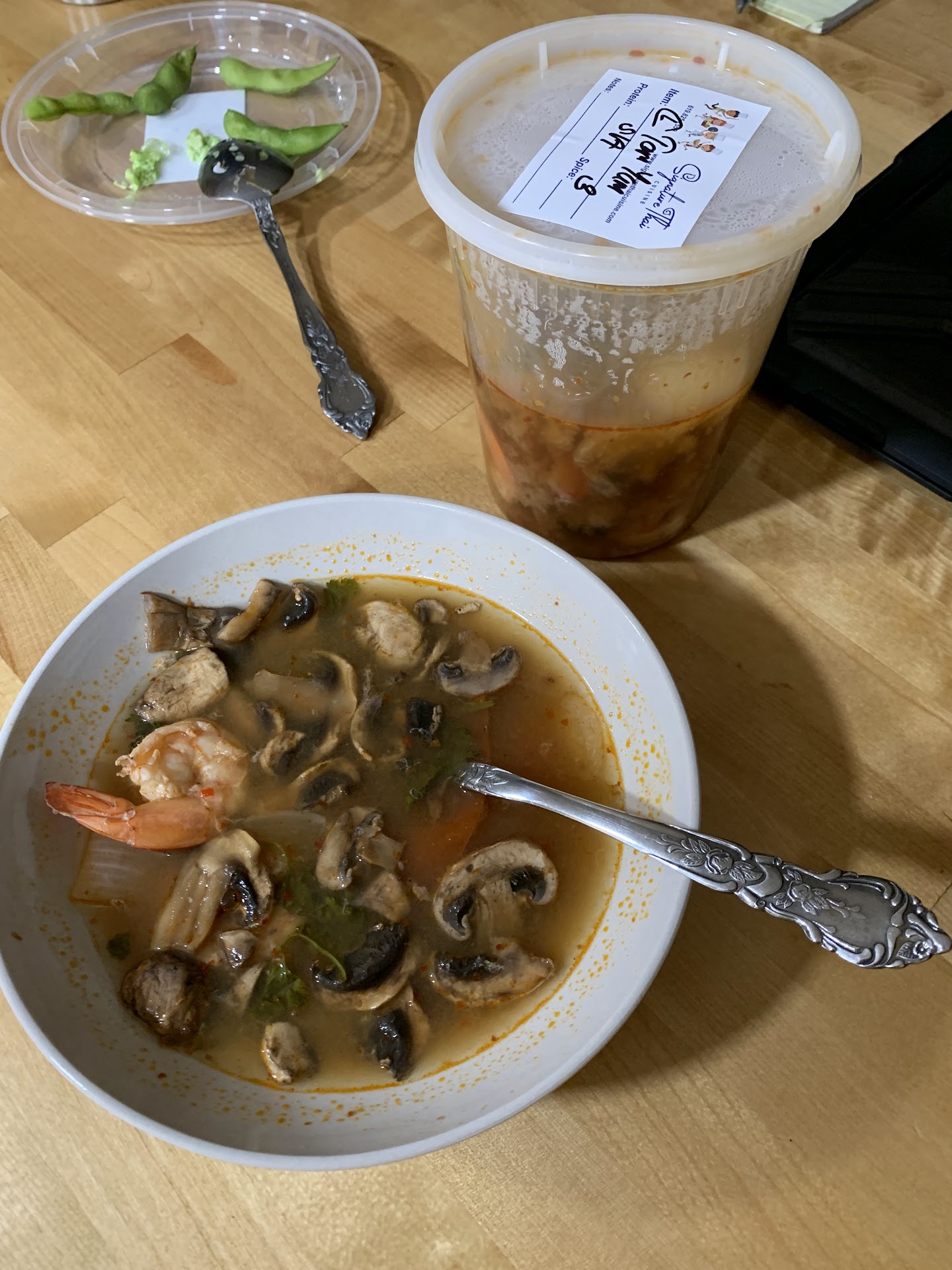 The cost of my Tom Yum doubled with shrimp, which is this soup’s traditional, basic ingredient. I was not aware of an upcharge until afterwards. The flavor was good, there were 6 medium shrimp.