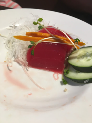 We ordered the tuna sashimi, which isn't cheap, mind you. When we got it, I remarked on the EXTREME beet-redness of the fish, which is usually a good sign, but the minute we began to cut it up for our daughter, it smelled VERY fishy and not at all fresh. We suspect they add food coloring to it, as it left red residue on the rice and the plate (pictures attached). My husband ordered the tonkotsu ramen, which looked NOTHING like the picture, the broth was watery and bland, and the meat was very meh. The broth wasn't even the same color as in the menu.