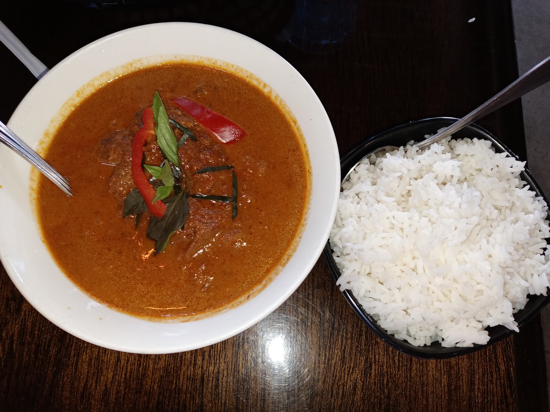 I took my girlfriend out on a quiet Monday night and this was solid Thai food— We had the green curry, the pad Thai with drunken noodles, and mango sticky rice. All of it was very good. I got it the curry with medium heat and it was definitely hot enough!