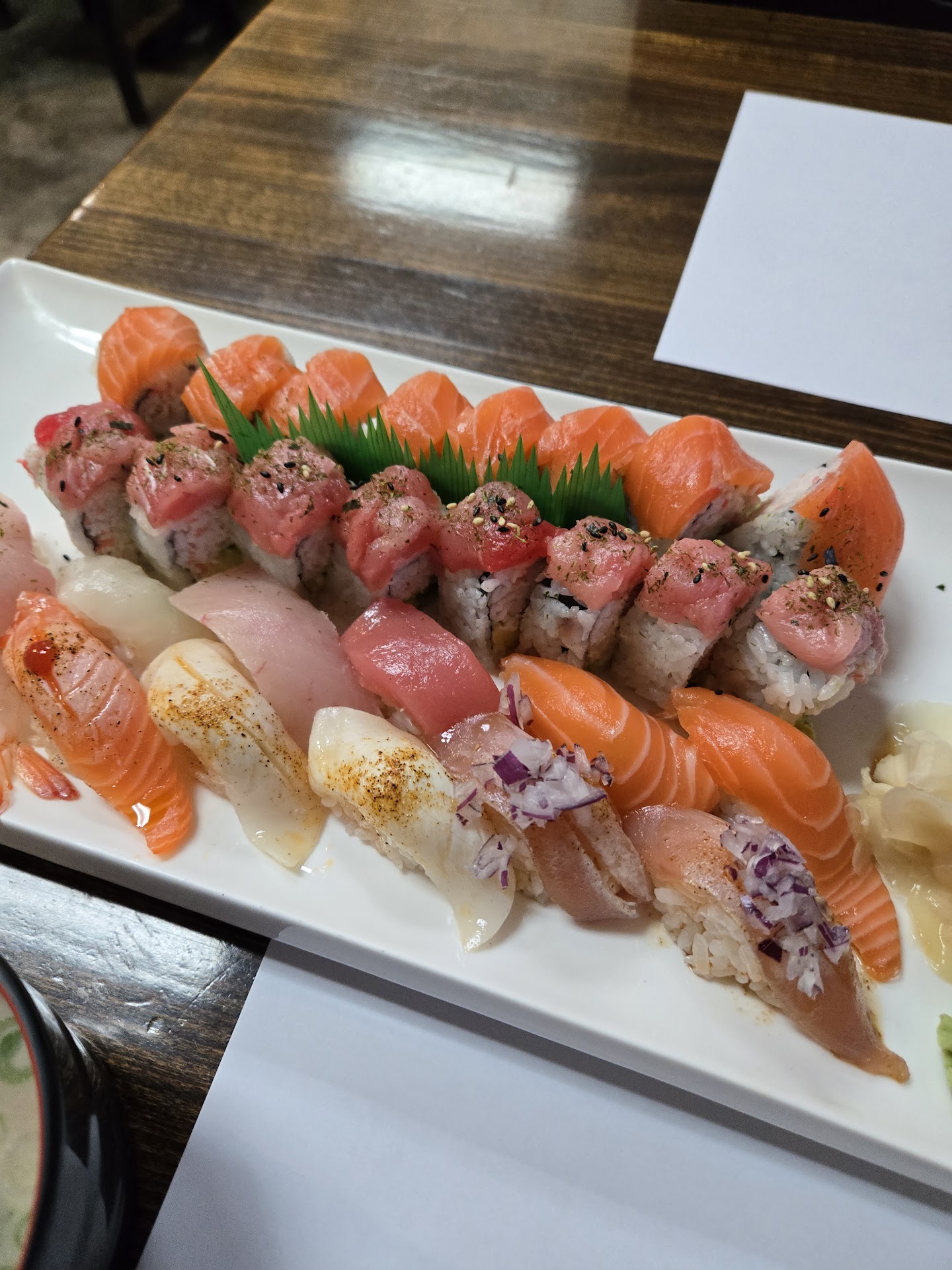 Small sushi shop in a Korean centric market plaza. Had a late lunch here, offers sushi and sashimi combos for a very reasonable price. Offers bento box type plates as well. Seemed to be a one man operation. Well made sushi, tasty spicy crab mix in the rolls we ordered: shrimp tempura and Sakai roll , topped with fresh clean tasting fish. The shrimp sushi was also served raw here. Overall very good food. Water is self serve. Small restaurant has tables that can accommodate about 20 people at a time. Nothing fancy, clean overall. Parking can be difficult when it’s weekends because of the grocery store in...